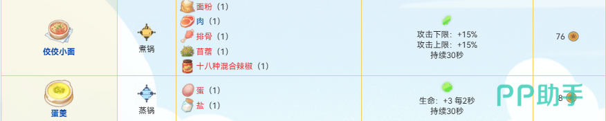 面食类配方在中期资源链成型后成为主力补给方案。葱油饼需面粉、沙葱、盐,其中沙葱分布于西坡灌木丛,面粉通过磨坊加工小麦获得,食用后饥饿值恢复效率高于同阶主食。奶香板栗需驼牛奶、板栗、糖,驼牛奶来自驯养骆驼每日产出,该料理提供中量体力+微量耐力加成,推荐用于连续下矿或远距离运输任务前。蛋卷由鸡蛋、驼牛奶、面粉组成,便携性极佳,是地图快速移动场景下的标准配置。蛋包饭需鸡蛋、米、酱油,三者均可稳定量产,恢复速率均衡,建议批量制作并随身携带5份以上,应对密集型主线任务。