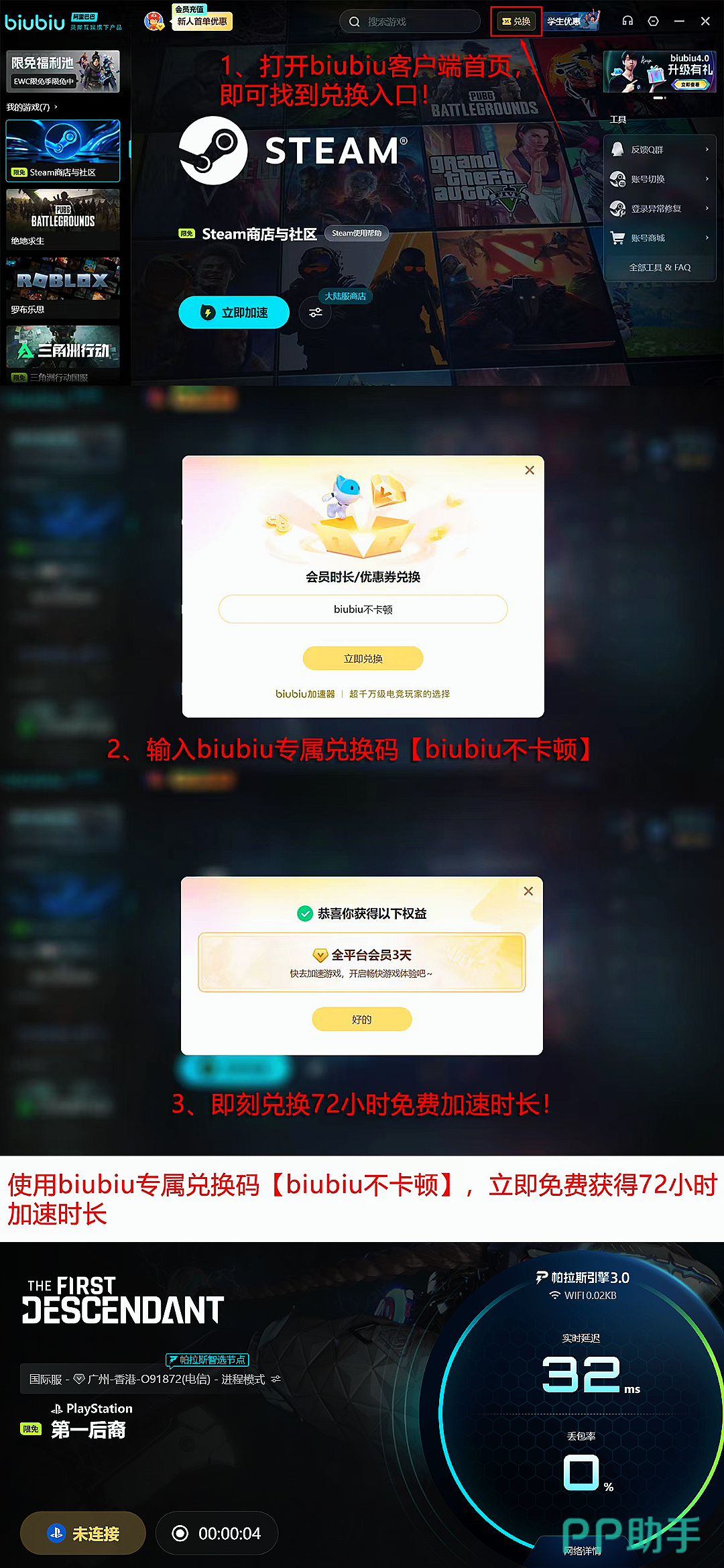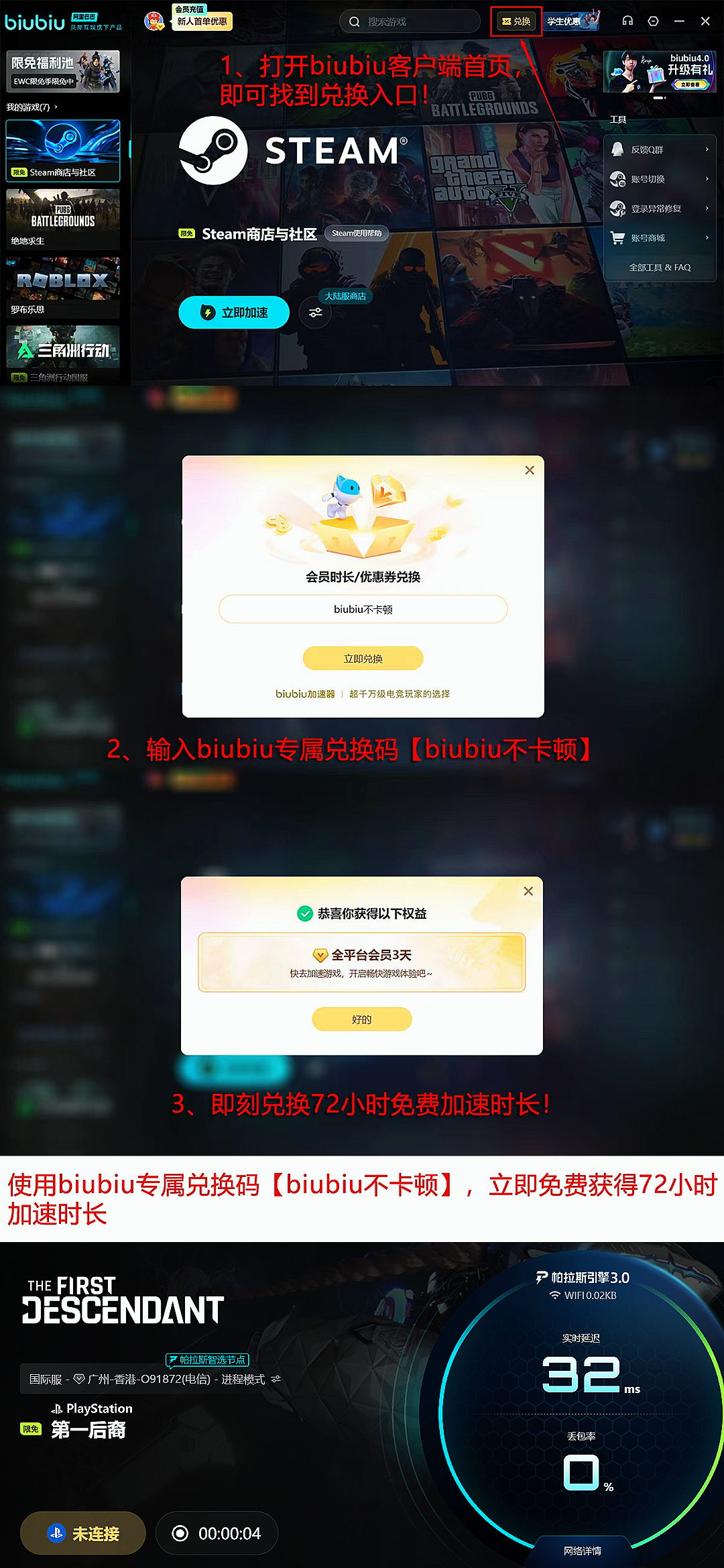 用户权益方面,biubiu加速器提供即时可用的新手激励:完成账号注册后自动发放24小时全游戏通用加速时长;所有用户输入专属兑换码【biubiu不卡顿】,即可额外激活3天连续加速权限。新用户两项福利叠加,总计可享96小时无门槛加速服务,覆盖完整新手成长周期与高频对战阶段。