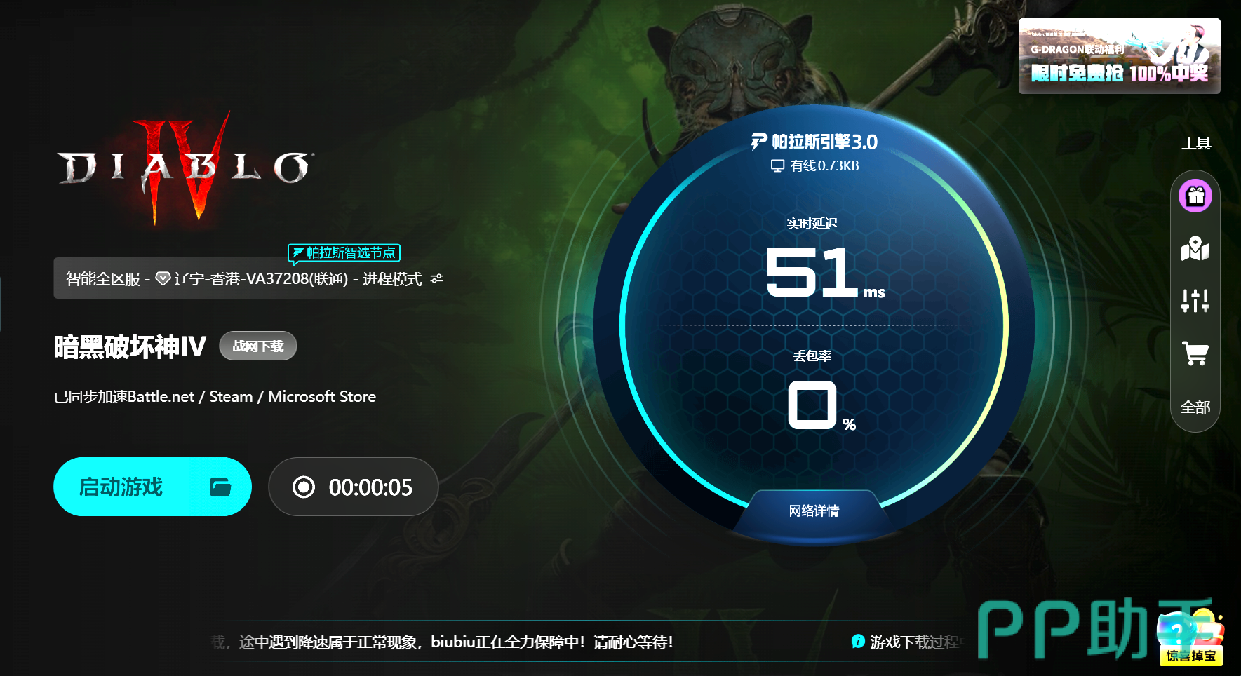 操作层面延续极简设计逻辑:启动biubiu客户端后,在搜索框键入“暗黑破坏神4”,选择对应游戏条目并点击“一键加速”,系统即自动完成协议识别、节点协商与加密隧道建立,全程平均耗时2.3秒,零配置需求,适配Windows与macOS双平台用户。