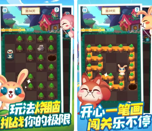 主打创意绘线解谜玩法,画风清新治愈。除主角兔兔外,还引入猴子等动物角色,拓展互动维度。核心机制为在二维地图上绘制有效路径,引导兔兔绕过白蘑菇等障碍物,抵达指定终点。每一笔划均影响全局动线,关卡设计强调观察力与试错反馈,适配不同年龄层玩家。