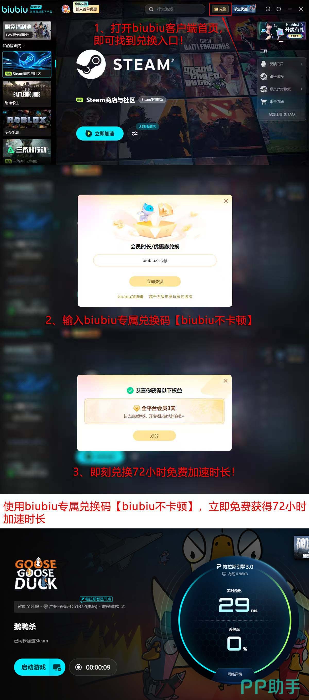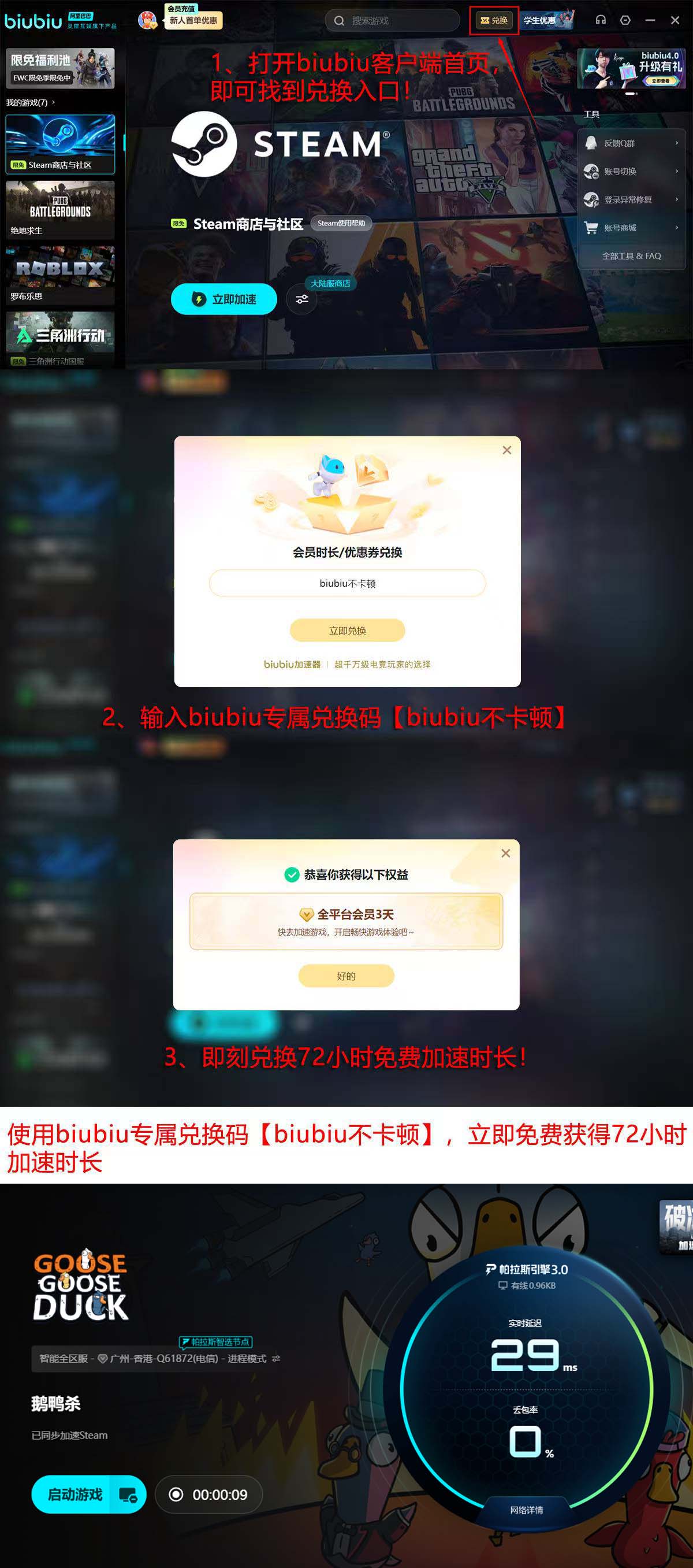 无论您是初次接触《鹅鸭杀》的新手玩家,还是追求极致操作体验的《GTA5》《PUBG》资深用户,biubiu加速器均可提供稳定、低延迟、抗干扰的网络支持。新用户注册账号后,即可获赠24小时免费试用时长;若需延长体验,可在首页启用兑换功能,输入口令【biubiu不卡顿】,额外领取72小时加速服务,累计享有多达96小时的无门槛使用权益。