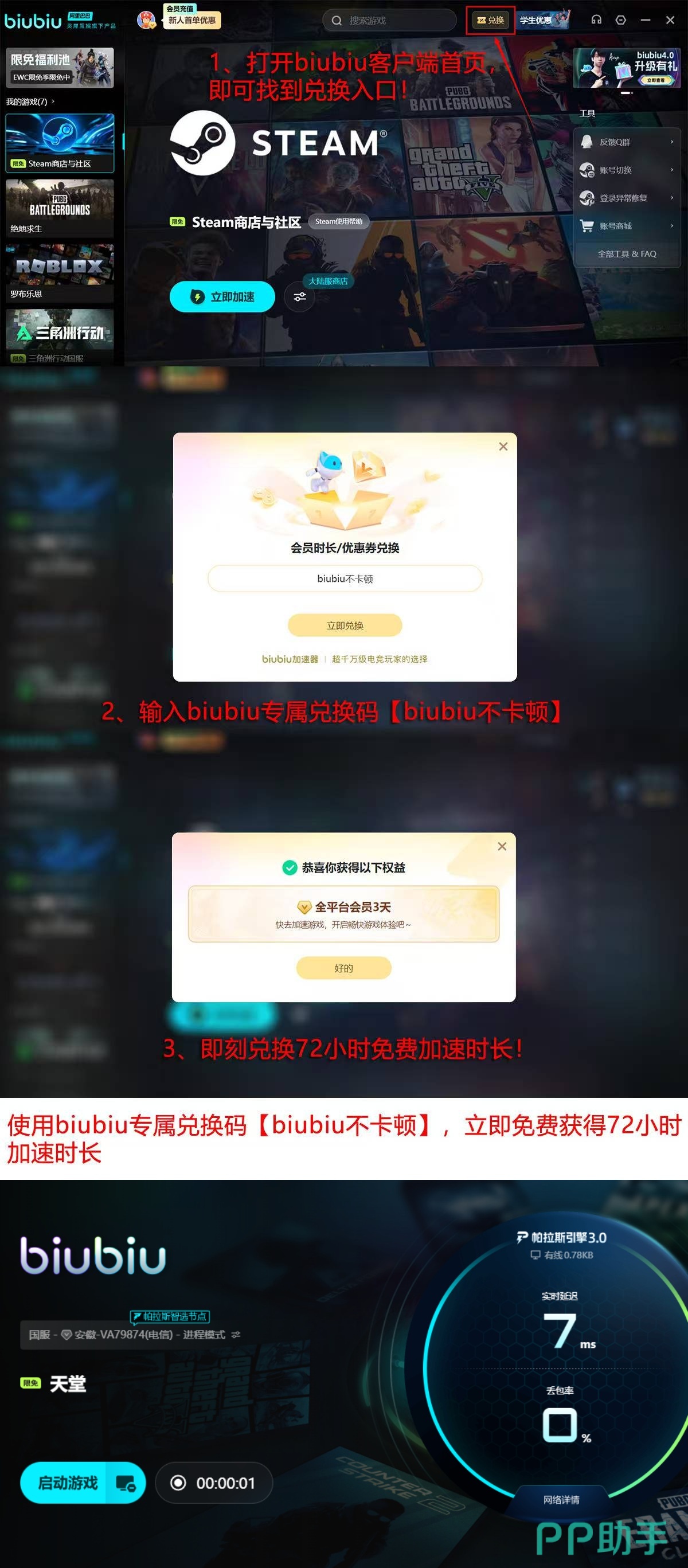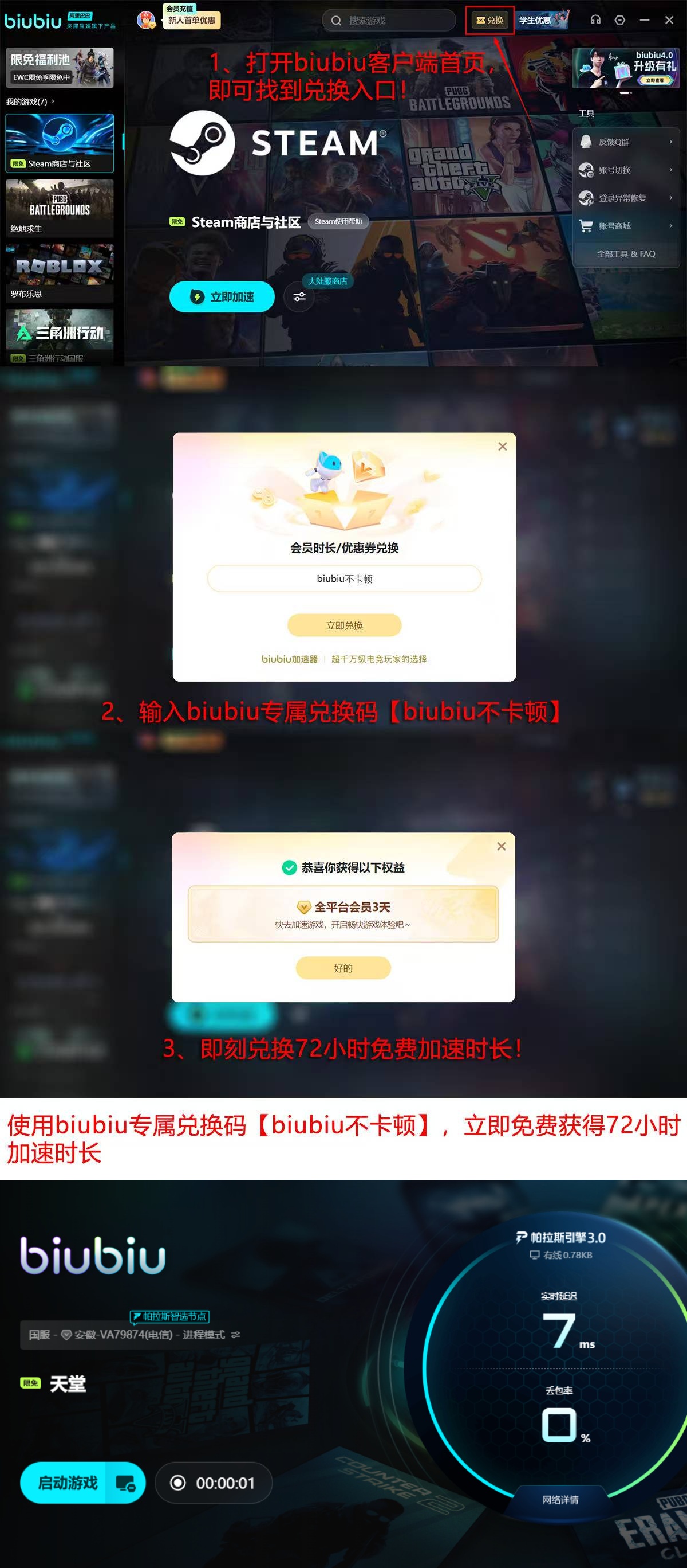 针对尚未使用过网络加速服务的新用户,biubiu加速器提供双重新人激励政策:完成首次账号注册即可获赠24小时全游戏免费加速权益;另可通过输入专属口令【biubiu不卡顿】额外领取72小时加速时长。两项福利支持叠加使用,单账户最高可一次性获得96小时无限制加速服务。