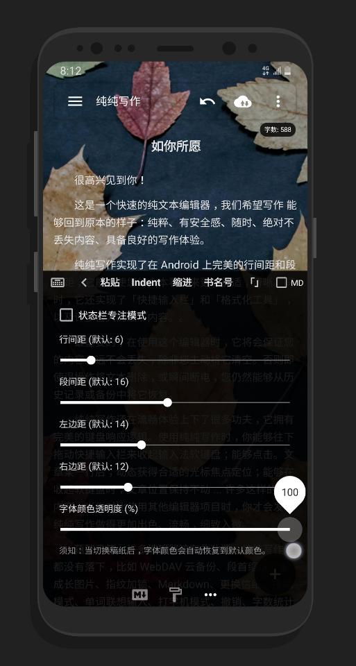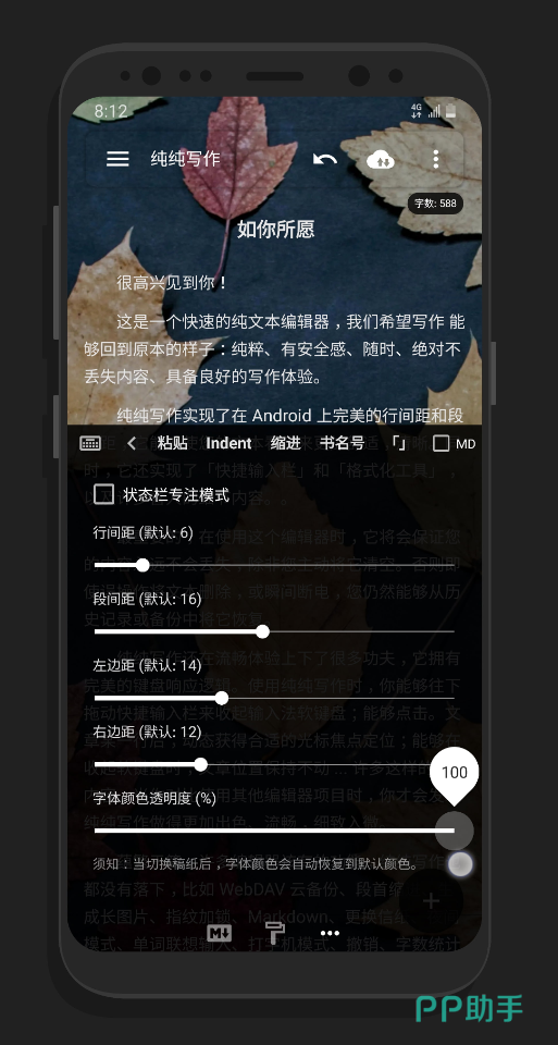 给写作一个纯粹的环境,让整个身心都能放松且变得更加专注,界面就是单调的黑色跟白色,简约、简洁的应用设计观看更舒服,编辑好的文稿可支持十几种的格式导出,对写好的文稿还能设定密码来保护隐私安全,有备份的云端能避免文件会丢失。