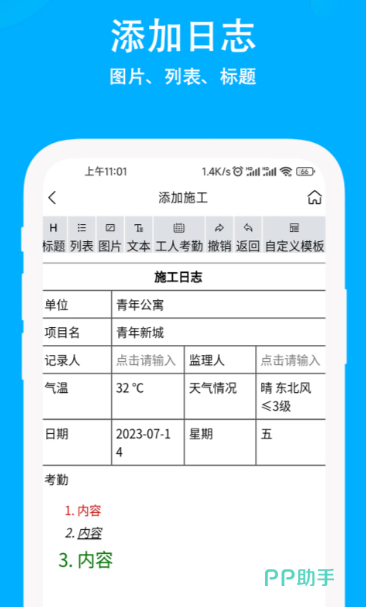 该系统的核心能力在于对建筑记录的规范化和可追踪性。在每天的工作结束之前,系统会自动引导您填写必须填写的天气,施工内容,机器的使用,材料的进场等等,并建立一个标准化的工作日志模版。在实地拍照后,会自动增加带有地理位置水印的时间戳,以供监理接受。