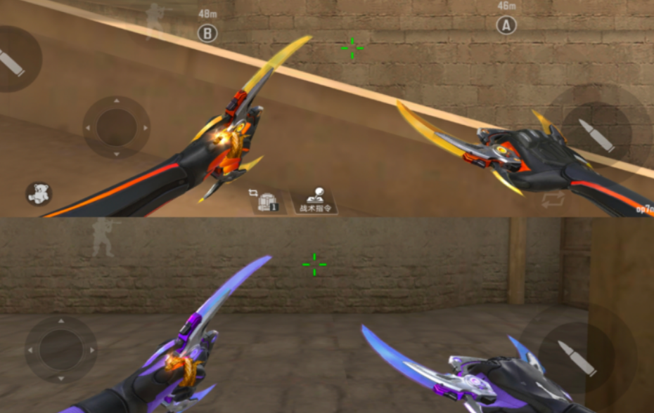 乔月这边风格完全不一样,走的是活泼少女路线。潜伏者是双麻花辫,保卫者是双丸子头半披发,灵魂武者形态是高马尾,三种造型看起来都很有活力。竞技模式里乔月的专属近战武器是鸳鸯钺,阵营不同颜色也不一样。生化挑战模式里换成鸳鸯环,有生化加成,重击能打出两段伤害,配合两段伤害数值叠加,实战里杀伤力不低。她的专属近战武器切出来不减移速,这点还是挺方便的。