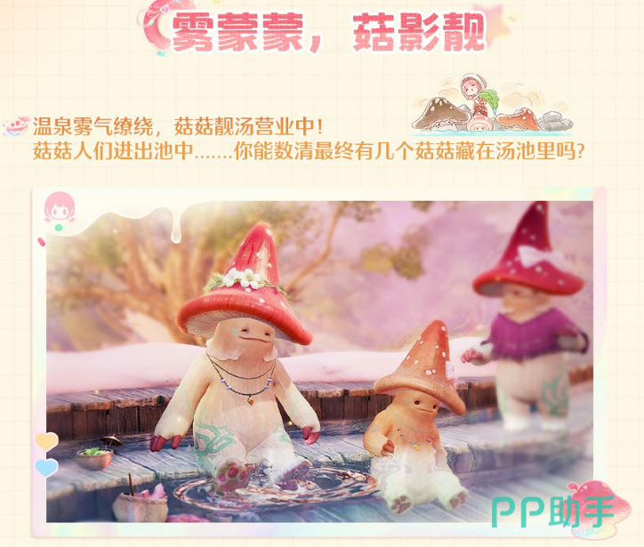 「雾蒙蒙,菇影靓」要去菇菇靓汤附近找艾汤汤,和她参与挑战,奖励同样是钻石加养成材料。「连连碰,菇欢乐」则是在溜溜索旁边,找到艾投投就能开始,奖励内容一样。最后一个「冰凉凉,菇飞扬」稍微简单一点,找到巨型冰沙旁边的艾沙沙,和她说话就可以参与,奖励是钻石。
