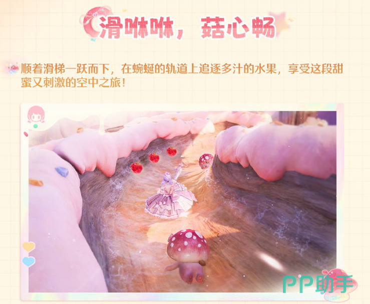 完美偶像冠军庆典那边这次集中了好几个小活动,风格比较轻松,以趣味挑战为主。「滑咻咻,菇心畅」是在滑梯旁边找一个叫艾滑滑的角色来触发的,完成挑战可以获得钻石和养成材料。「溜溜转,菇机敏」是体验旋转跳跃类型的玩法,画面据说是彩绘风格,奖励也有钻石和养成材料。