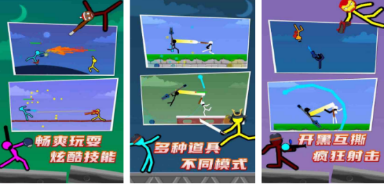火柴人是此游戏的主要角色,凭借特别流畅又独特的操作机制,还将动作以及射击的元素相互结合,这游戏更注重以及更强调的就是连招组合以及特别炫酷的打击感,通过触摸滑动的方式,就可做出跳跃躲避以及近战攻击的动作体系。其次,还支持2v2匹配对战或者8名玩家同场大乱斗的模式,通过参与热血战斗即可提升自己的段位值,最高可升级至王者射手。