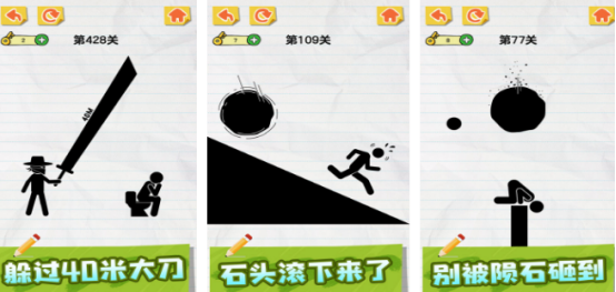 海量精心设计的关卡内容都有不同的挑战,所谓是关关不同,起初的关卡难度可能特别简单,核心的任务就是用手指在屏幕上画线的方式来保护好其中的火柴人,关卡了开始之后都可以给出相应的提示,比如有的关卡中需要让大家通过划线的方式,帮助火柴人躲避40米的大刀,有的却需要在石头滚下来之前必须做好划线的方式保护火柴人。