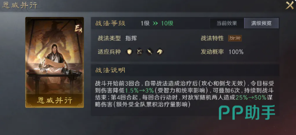 它能在战斗开始前3回合,自带战法造成治疗后,让目标队友受到的伤害降低可叠加6次,第4回合起每回合行动时,对敌军随机两人造成伤害,这个是刘备薪火枪的强力适配战法,高度契合薪火枪中后期作战节奏,适合刘备、张宁、曹操等自带治疗效果的武将,其中刘备每回合的4段治疗能充分发挥战法收益,为全队筑牢防线,并且补充体系的后程输出。