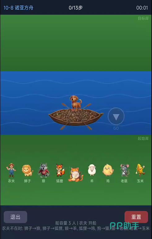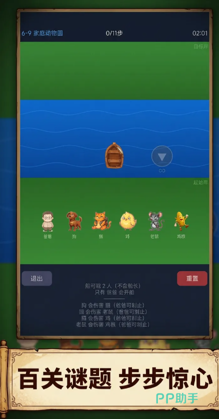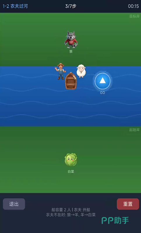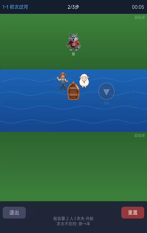 游戏的玩法就是使用有限的运输工具,在不发生冲突的情况下,将所有角色安全送到对岸,玩法简单容易上手,但却有着复杂的约束条件,比方说有的角色不能在同一艘船上,每次运载人数存在上限等,玩家必须要通过多回合的精确规划与逻辑推理,才能避免触发失败条件完成全员渡河的目标。
