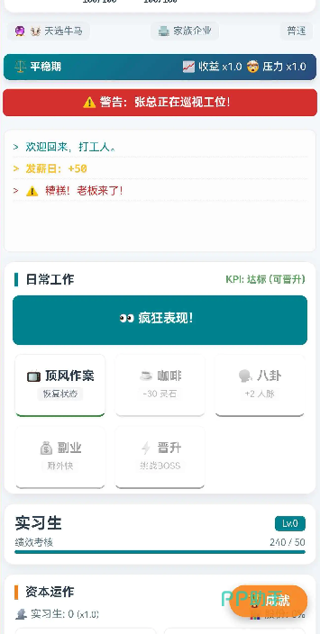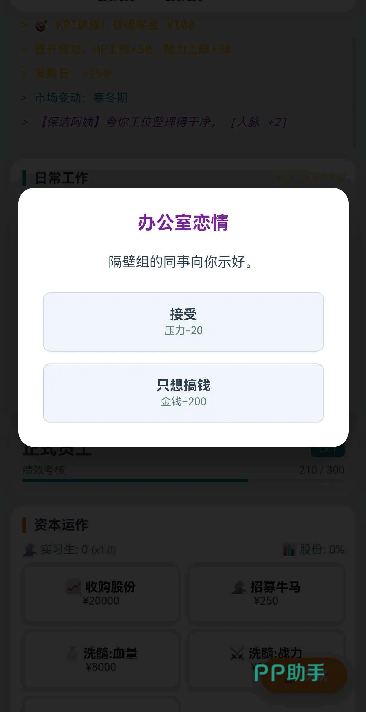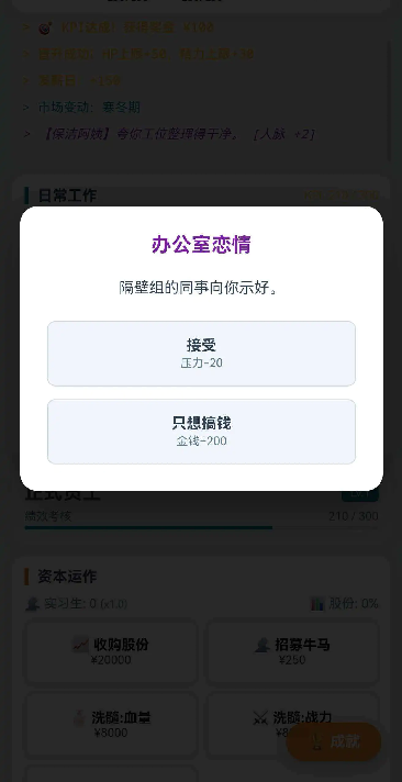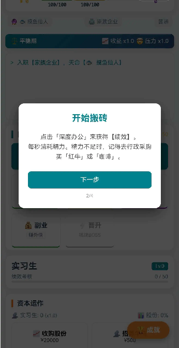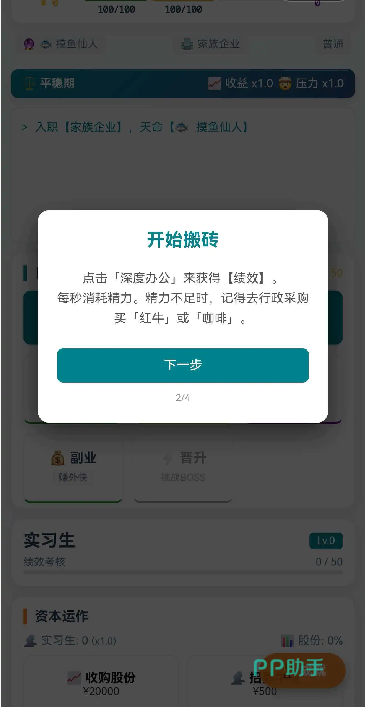 在这里可以选择开始搬砖,通过深度办公来获得绩效,每秒都需要消耗精力,精力耗尽后,此时可去行政处采购,可购买“红牛”或者“咖啡”来回复状态;最初作为实习生,是会有绩效考核的。