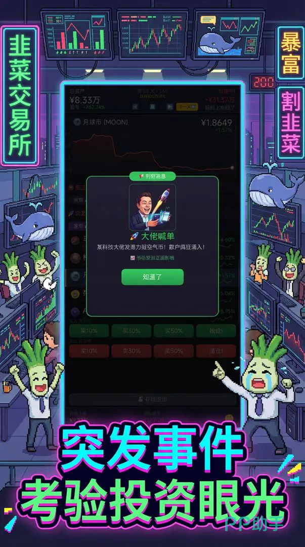 至于韭菜交易所好玩吗?对于喜欢操作类动作游戏的玩家来说,或许比较枯燥。但对于喜欢经营类,喜欢动脑的用户来说,这个游戏还是很有趣的,很多小节点都值得大家揣摩,只有做出正确的选择,才能够顺利的将资金翻倍,从韭菜逆袭成为大佬。