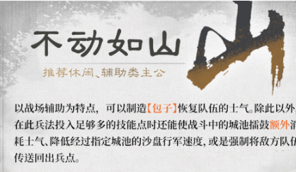 【不动如山】定位于稳固防御体系:通过制造士气回复类道具维持队伍持续作战能力;“擂鼓助威”可对目标城池施加士气压制,降低敌军行军效率;更具备强制位移机制——将已抵达前线的敌方部队直接传送回其出兵起点,极大延缓进攻节奏,显著提升防线容错率与持久抗压能力。