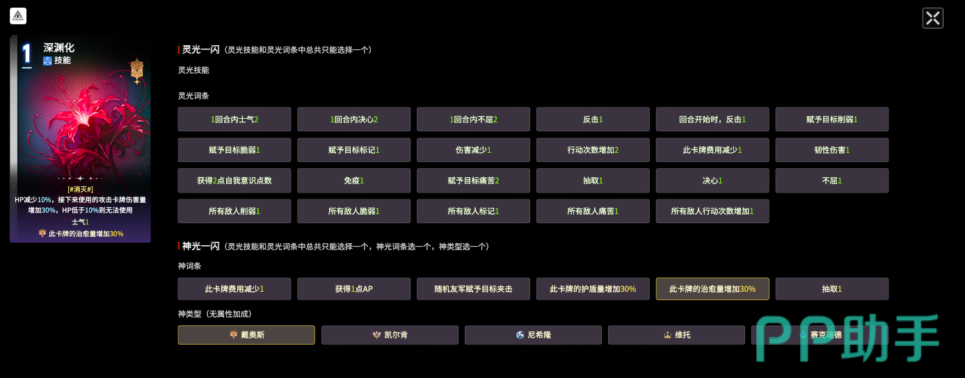 第二张卡牌”神圣一击“,在启动”消灭“状态后,此卡牌的伤害可以达到200%,达成的流血量十分可观,建议使用的神词条包括”卡牌的韧性增加100%“、”此卡费用减少1“、”赋予目标痛苦4“,这四个词条可以减少相关费用,而且在流血量上也起到了较强的辅助作用。