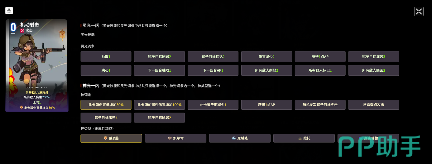 最后一张必备流血伤害卡牌——机动射击,作为一个高攻击性的万金油卡牌,开展后即可使用,可对敌人增加200%的伤害,让敌方快速流血,在对战过程当中比较推荐的灵光词条是”下一回合抽1“,“所有敌人削弱2”;而神词条则是“此卡伤害量增加30%”、“此卡任性伤害增加100%”。