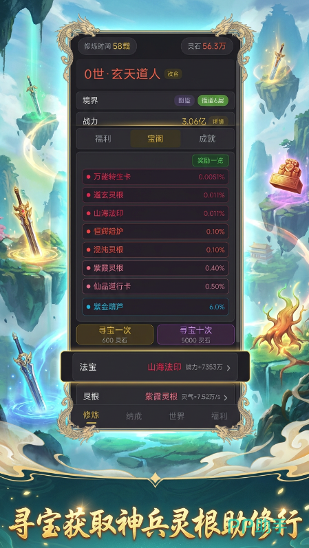 这款游戏一开始就具有很强的吸引力。给玩家搭建起一个完整得修仙体系,从入门阶段的练气期开始,经历各种修炼考验之后最终成大罗金仙。不同于大多数修仙游戏里的“打怪升级”,本文的修仙世界中将寻宝与转生融合在一起。故事主线就是找寻传说中的天机宝物,不断修炼提升自己的修为。玩家不断地去获取法宝并提高境界来解开仙道的秘密,而每一次的转生又会给玩家带来新的挑战以及更高的修炼水平。境界越高,获得的能力就越强,得到的法宝就越多,生活境遇也就越好。这样一种渐渐加强、不断发展的过程,给游戏赋予了长久坚持的价值。