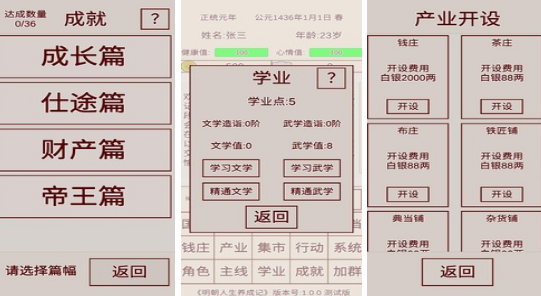 以明朝为基础题材的单机文字游戏,来到明朝当中,可以入朝为官,也可以成为一名经商者,多种不同的发展路线等你选择,如果想要经商种田的话,那么可以扩张个人的商业版图,积累更多的财富,还可通过与其他玩家联姻的方式培养子嗣,让自己的家族势力不断增加,游戏中并没有单一的目标,允许小伙伴们任意选择,可以打造出属于你的平淡人生,又或者是传奇人生。