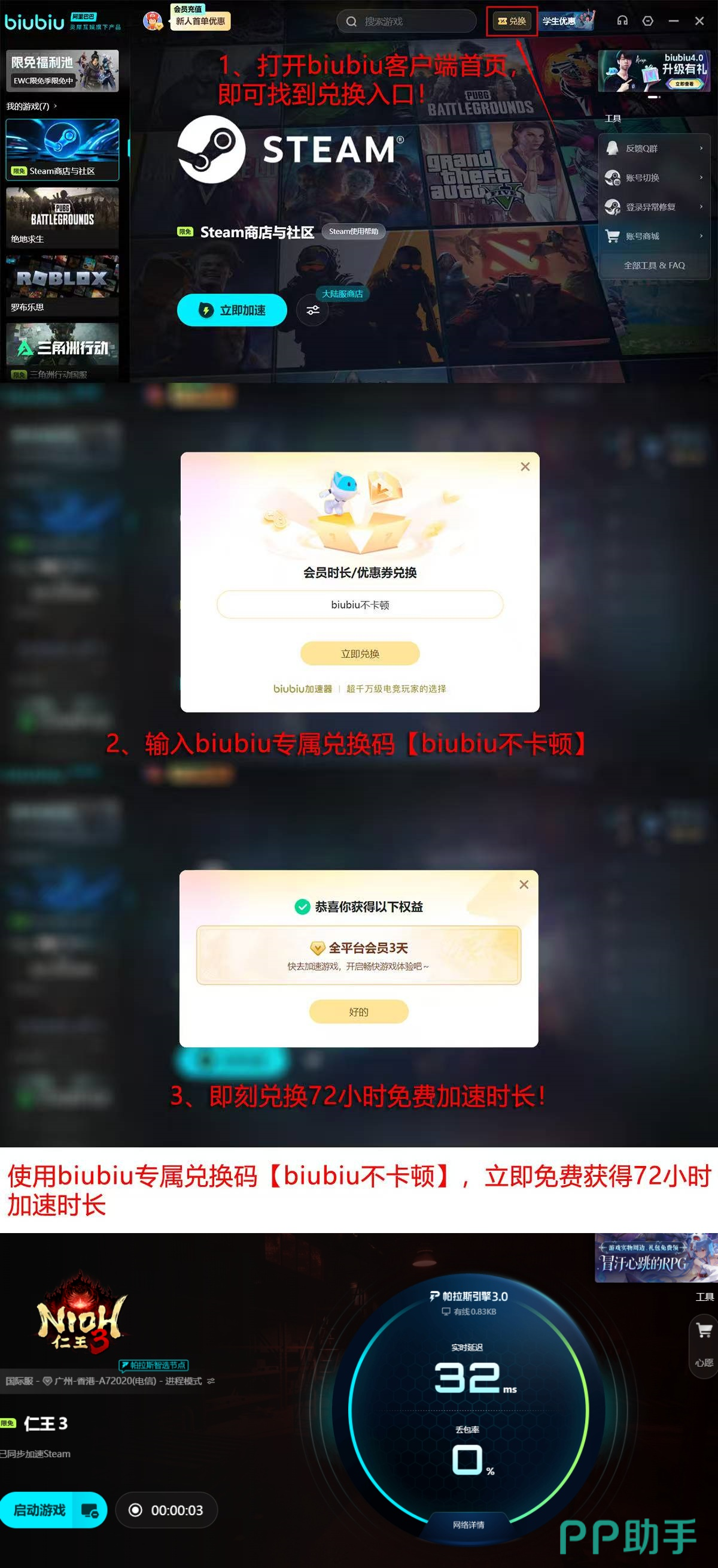 当前版本还开放多项实用福利:【biubiu不卡顿】兑换码可领取72小时高级服务时长,叠加新用户注册即赠24小时免费使用权,总计零成本获取96小时完整加速权限。平台游戏库覆盖全面,主流及小众热门作品均已预置优化策略,适配性表现优异。