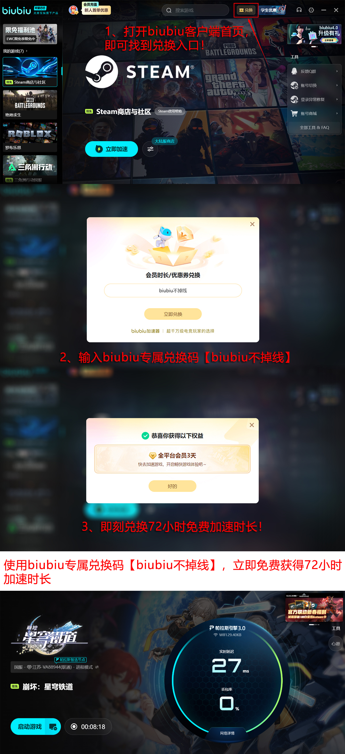 福利优惠也多多,快来注册biubiu新账号,这会给用户送来免费的24h加速时间用的,然后兑换优惠也是正常开启中的,找到首页兑换栏输入【biubiu不掉线】吧,会轻松获取到额外的72h服务时间,叠加给新人用到的也就是96h服务时间了。