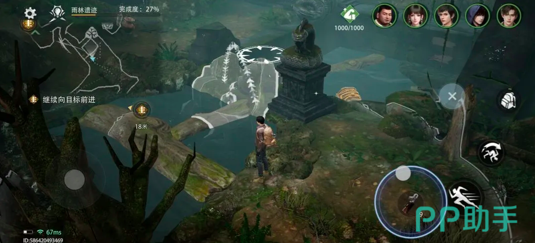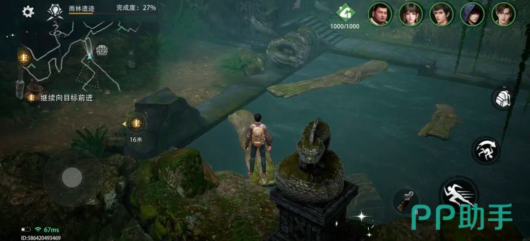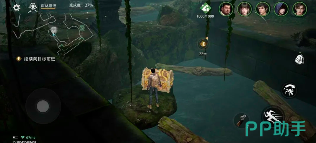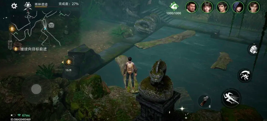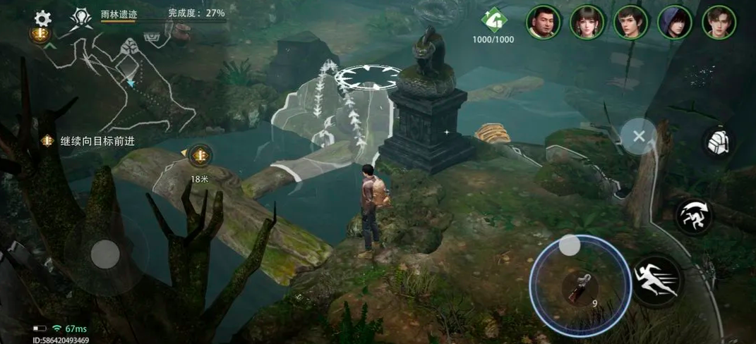该任务位于西王母国雨林遗迹章节。进入地图后,需先传送至对应区域,随后沿主线引导抵达密林地带。此处存在多座由天然岩块堆砌而成的石桥结构。参考图示位置,建议优先编入吴邪作为主力操作角色——其专属解谜属性可显著提升交互响应效率;同时务必提前激活罗盘装置,该道具可使吴邪解谜成功率额外提升20%,是完成后续机关联动的基础保障。穿越浅水河道后,连续跃过两处山岩间隙,即可在右侧山体遮蔽下的水面上发现首个漂浮宝箱。