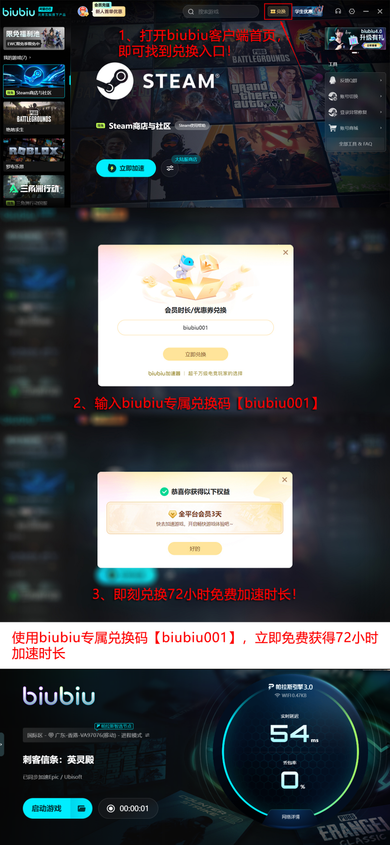 目前,biubiu加速器已通过职业赛事验证,成为PERO电子竞技战队官方指定加速工具。其搭载自研帕拉斯3.0引擎,可实现端到端网络延迟深度压缩,并通过多节点冗余、智能路径切换等机制,从协议栈底层规避单点故障导致的连接中断。为降低体验门槛,新用户首次登录即可获赠24小时免费加速时长;叠加专属激活码【biubiu001】,还可额外领取3天使用权,总计达96小时,充分满足中长期游戏需求。