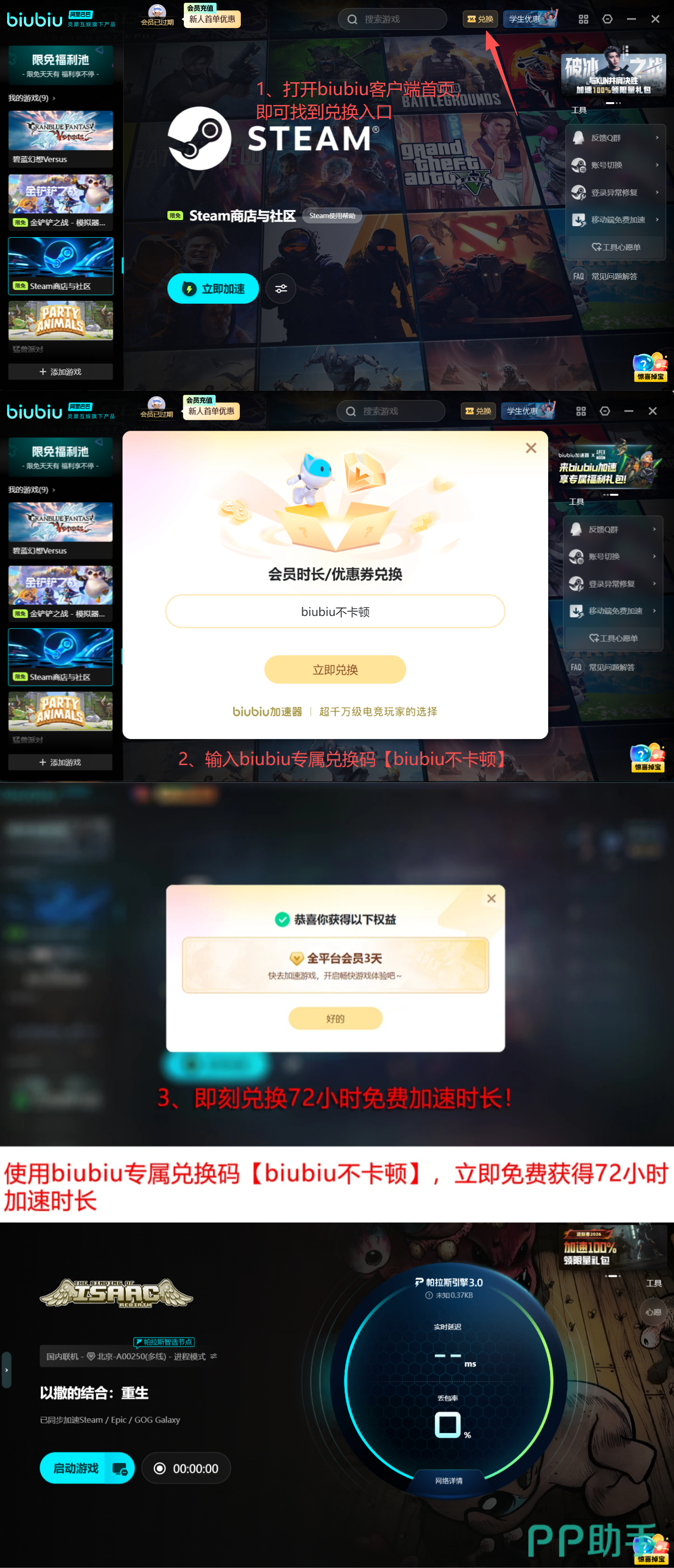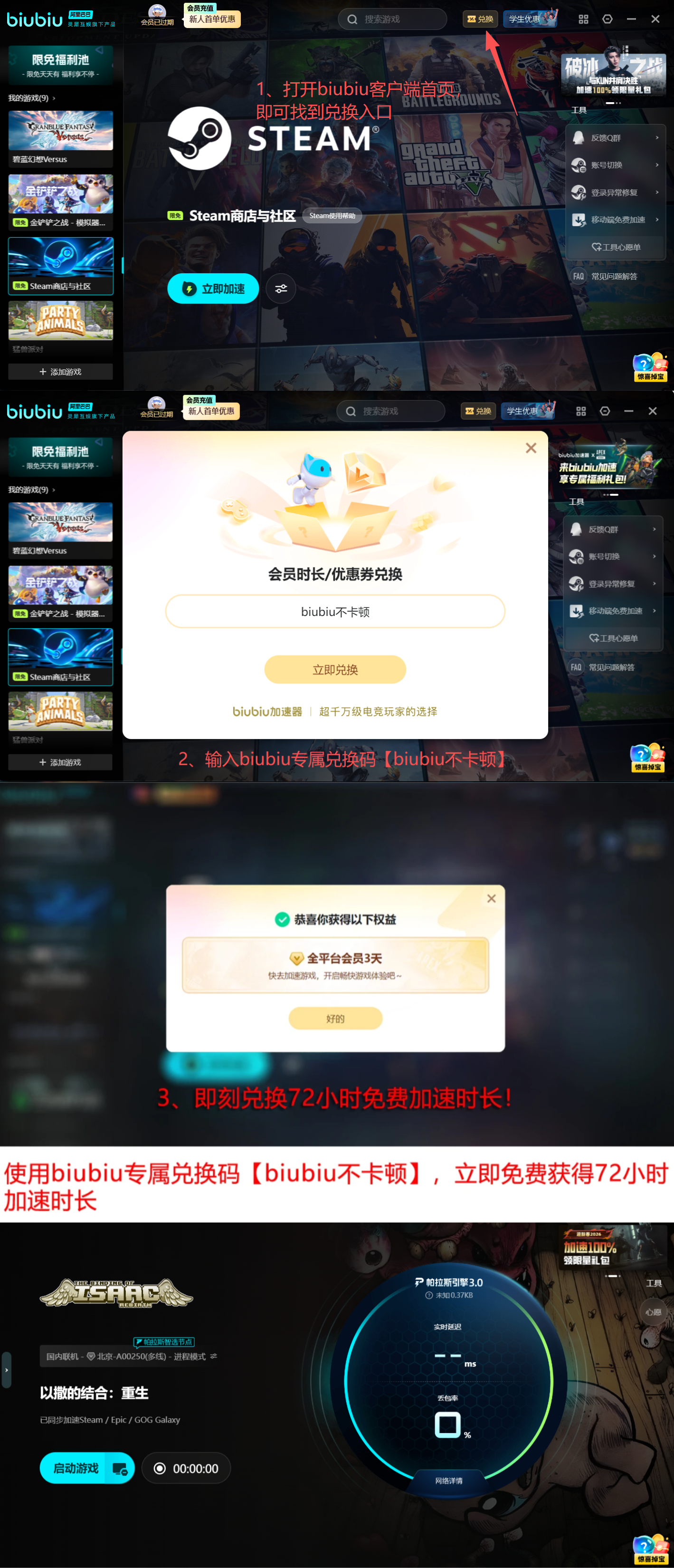 当前限时新用户激励计划已正式上线,聚焦提升玩家实际运行质量。首次注册biubiu加速器即可获赠24小时全网免密加速权限;输入专属激活码【biubiu不卡顿】,额外解锁72小时高级加速服务,累计享有96小时无限制高速通道使用权,全面覆盖《以撒的结合》本体、Rebirth、Afterbirth+及Repentance等全部版本,彻底消除联机延迟、存档同步失败与启动校验中断等问题。