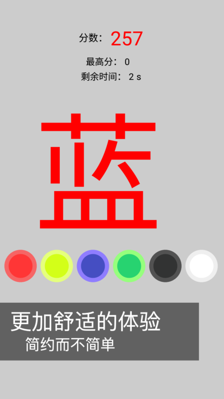 本作通过Stroop效应变式任务强化色彩感知能力,要求玩家快速判断文字内容与字体颜色是否一致,或识别渐变色块中的主色调。题库覆盖12种标准色系的混合组合,设置六大难度章节,每关题目量动态分布在20至40题之间,系统自动记录响应时间与正确率,形成个体化色彩敏感度成长曲线。