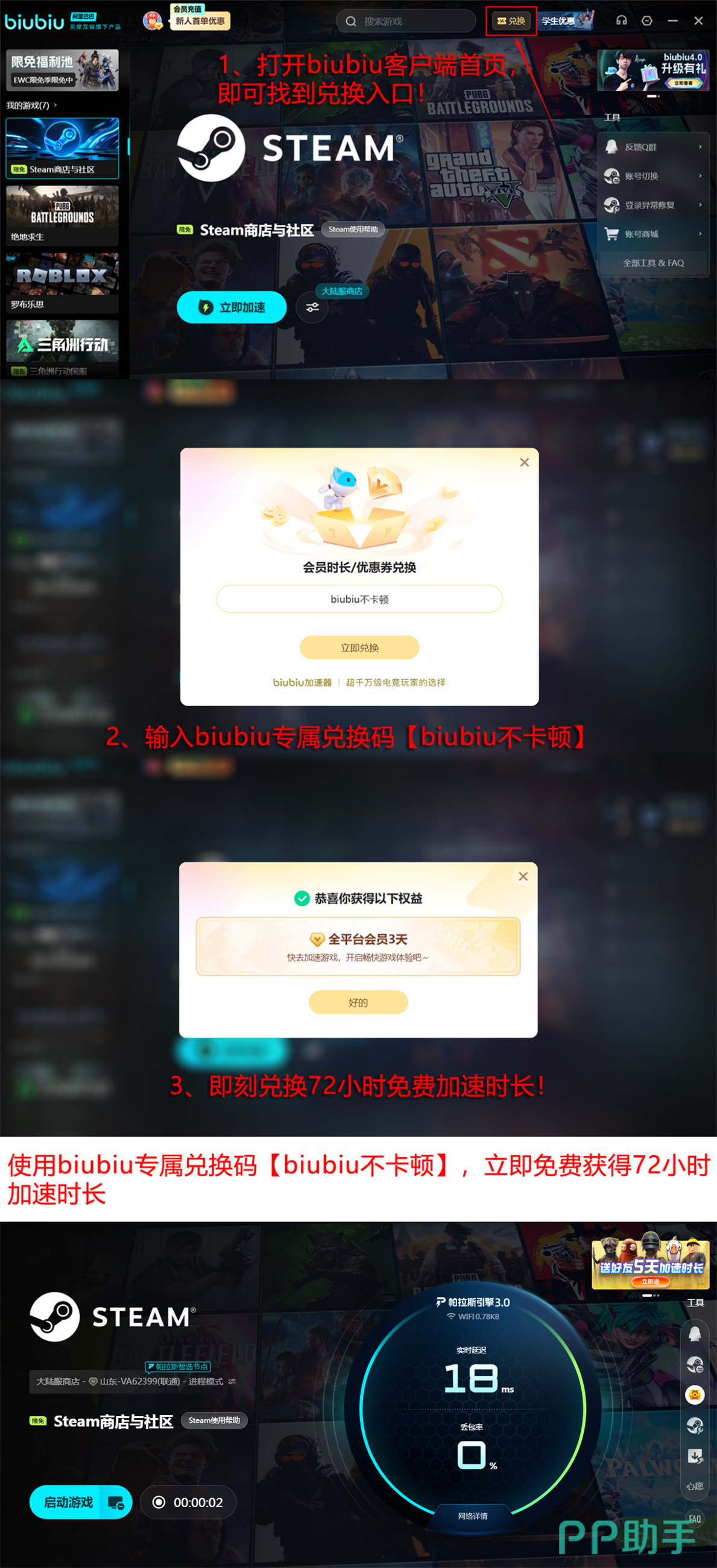 目前biubiu面向新老用户提供双重加速权益:所有账号均可通过输入兑换码【biubiu不卡顿】即时领取72小时全功能加速时长;新注册用户还将额外获赠24小时初始加速权限。建议新用户优先激活赠送时长,再使用兑换码叠加,总计可享96小时连续加速服务,覆盖完整下载+首次运行周期。
