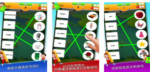 将英语词汇学习转化为图形化匹配任务。左侧为单词卡片,右侧为对应实物插画,连线成功即触发发音朗读与例句展示。关卡按CEFR A1-A2分级设置,避免认知超载。