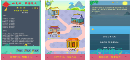 依托古诗文意象设计视觉化解谜关卡,如根据诗句意境拼合残缺画面、按平仄规律排列词句顺序等。卡通画风降低理解门槛,每关通关后附带作者生平与创作背景简析,实现文学素养与审美能力同步提升。