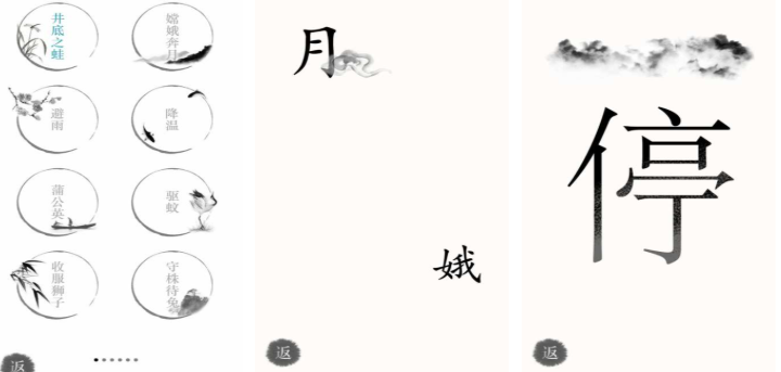 以汉字构形原理为解谜核心,设计拆分重组、偏旁置换、笔顺推演等创新关卡。黑白水墨风格强化文字本体意识,每个生僻字通关后标注甲骨文/金文演变图示,深化字源理解。