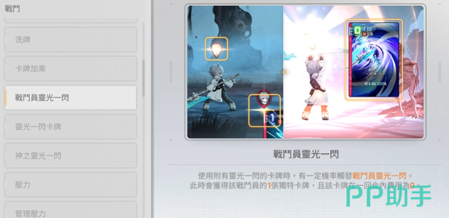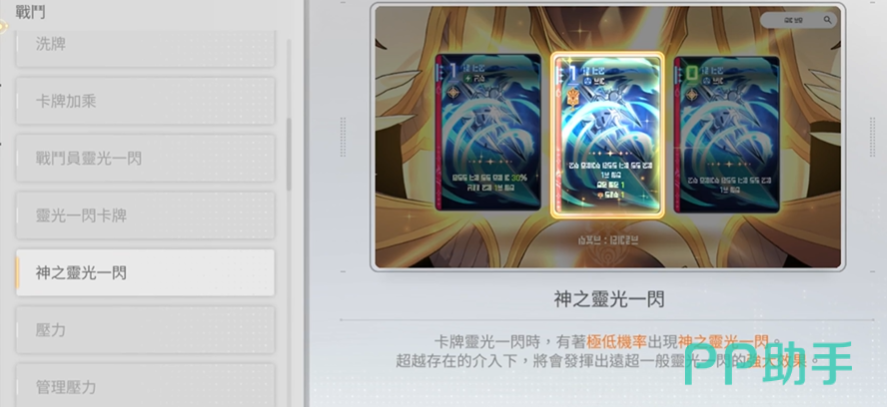 目前已确认的神闪词条共12种,每次刷新固定显示2至3条。常见词条包括:卡牌费用-1、AP值+1、士气值+1、决心值+1、护盾量+30%、治疗量+30%、伤害输出+30%、对目标施加痛苦状态、对目标施加脆弱状态等。这些词条具有极强的战术适配性——例如前期获取“费用-1+AP+1”组合,可大幅加快关键卡牌上场节奏;中后期叠加“痛苦+脆弱”,则能显著提升对Boss的单轮爆发效率。