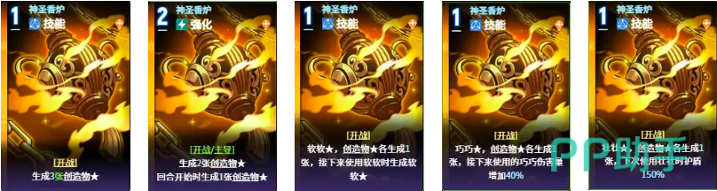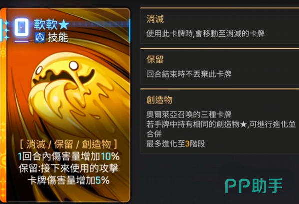 奥莱娅初始卡组配置为两张一费攻击卡、一张一费治疗卡,起手关键卡为“神圣香炉”,该卡于战斗首回合自动生成两张创造物。角色专属创造物共三类:软软、巧巧、壮壮,全部为0费技能卡,且每张均携带“消灭”“保留”“创造”三重词条,构成整套技能循环的底层支撑。