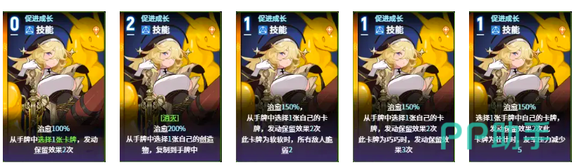 “促进成长”是一张费用为1的主动技能卡,可解锁50%治疗效果;若选择自身手牌中的创造物作为目标,则触发两次“预留”效果。例如选定一星壮壮,其保留状态下原本30%治疗将翻倍至60%;该卡首张使用时费用自动降低1点,第二张使用虽费用+1,但新增“削减”词条,并将效果转化为复制一张手牌中的创造物。