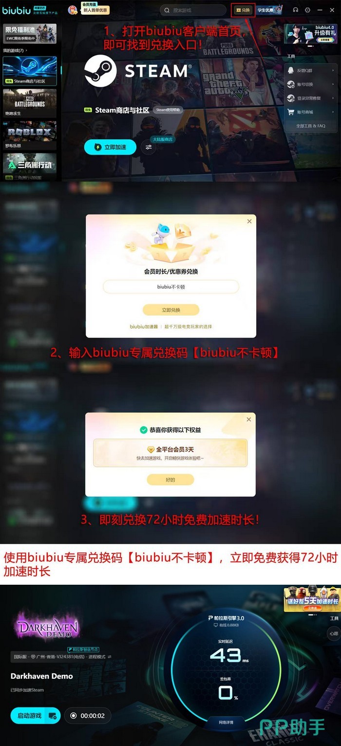 biubiu加速器已迭代至3.0版本,底层搭载全新帕拉斯引擎,全面升级节点调度策略与协议识别能力。本次重大更新特别邀请PUBG职业赛事冠军选手左梓轩担任技术体验官,全程参与多轮压力测试与参数调优。用户福利同步加码:所有用户输入口令“biubiu不卡顿”,即可兑换3天全平台高级会员权限;新用户完成注册后还将自动获赠24小时体验时长,两项权益可叠加使用,总计享96小时高品质加速服务。