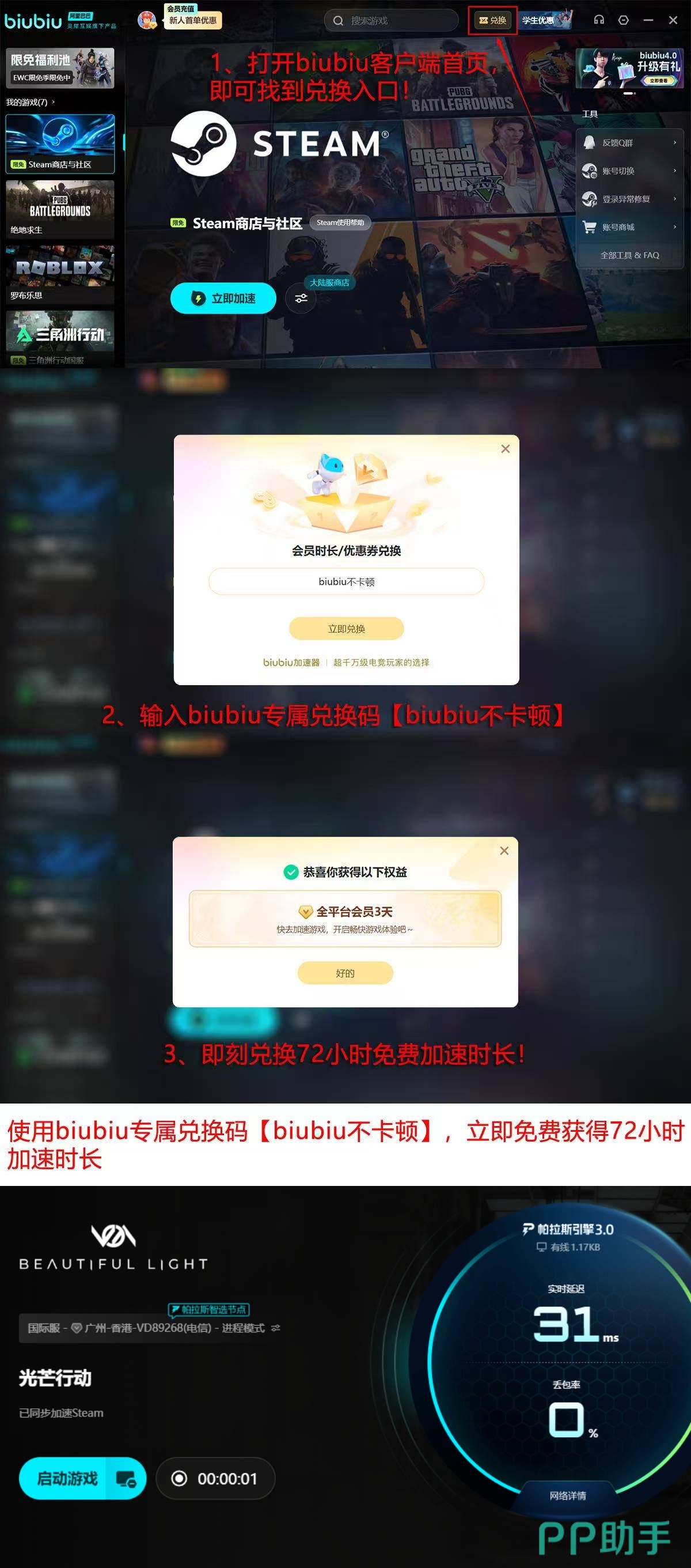 新用户首次启动biubiu加速器即可自动激活24小时全功能免费试用权限。如在激活界面输入专属兑换码【biubiu不卡顿】,还可额外领取3天连续加速时长,无需付费即可深度体验完整服务。