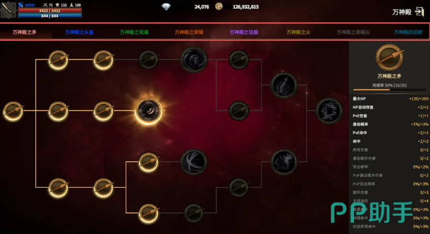 该系统以全体英雄为作用对象,基础加成覆盖生命值、攻击力、防御力三大核心属性;当玩家集齐特定装备套装后,还可额外激活神圣伤害、暴击伤害、吸血率、韧性等进阶属性。此外,通过挑战各类副本解锁专属技能槽位后,可点亮对应神殿技能——例如“万福神殿”不仅能强化整体战力,还能缩减技能冷却时间、提升角色负重上限,实现战斗容错率与操作自由度的双重优化。