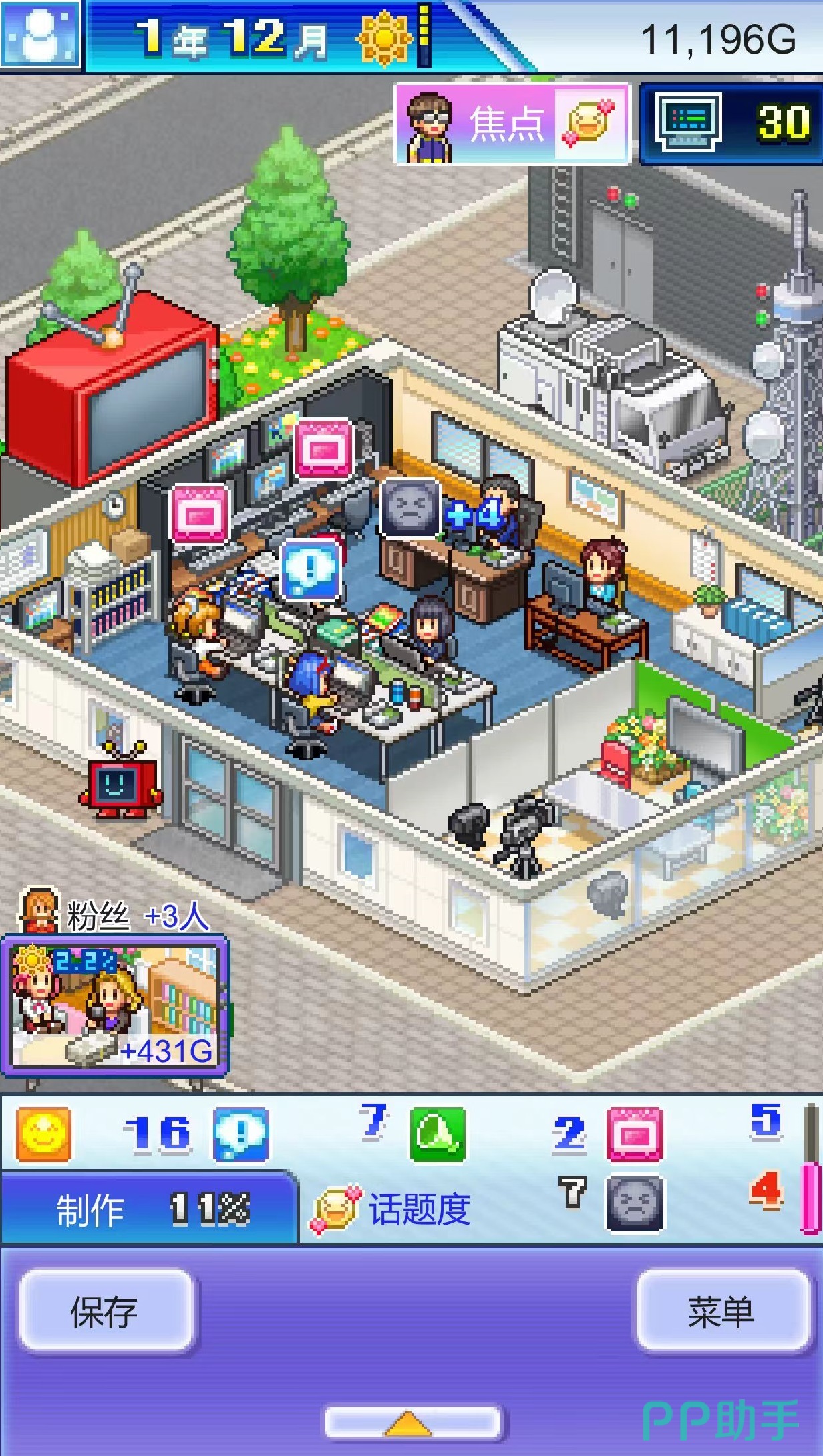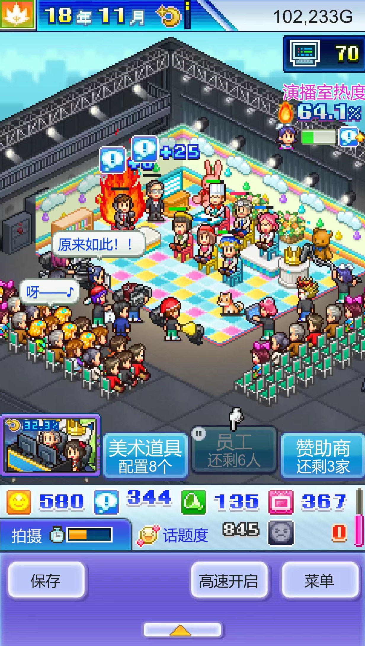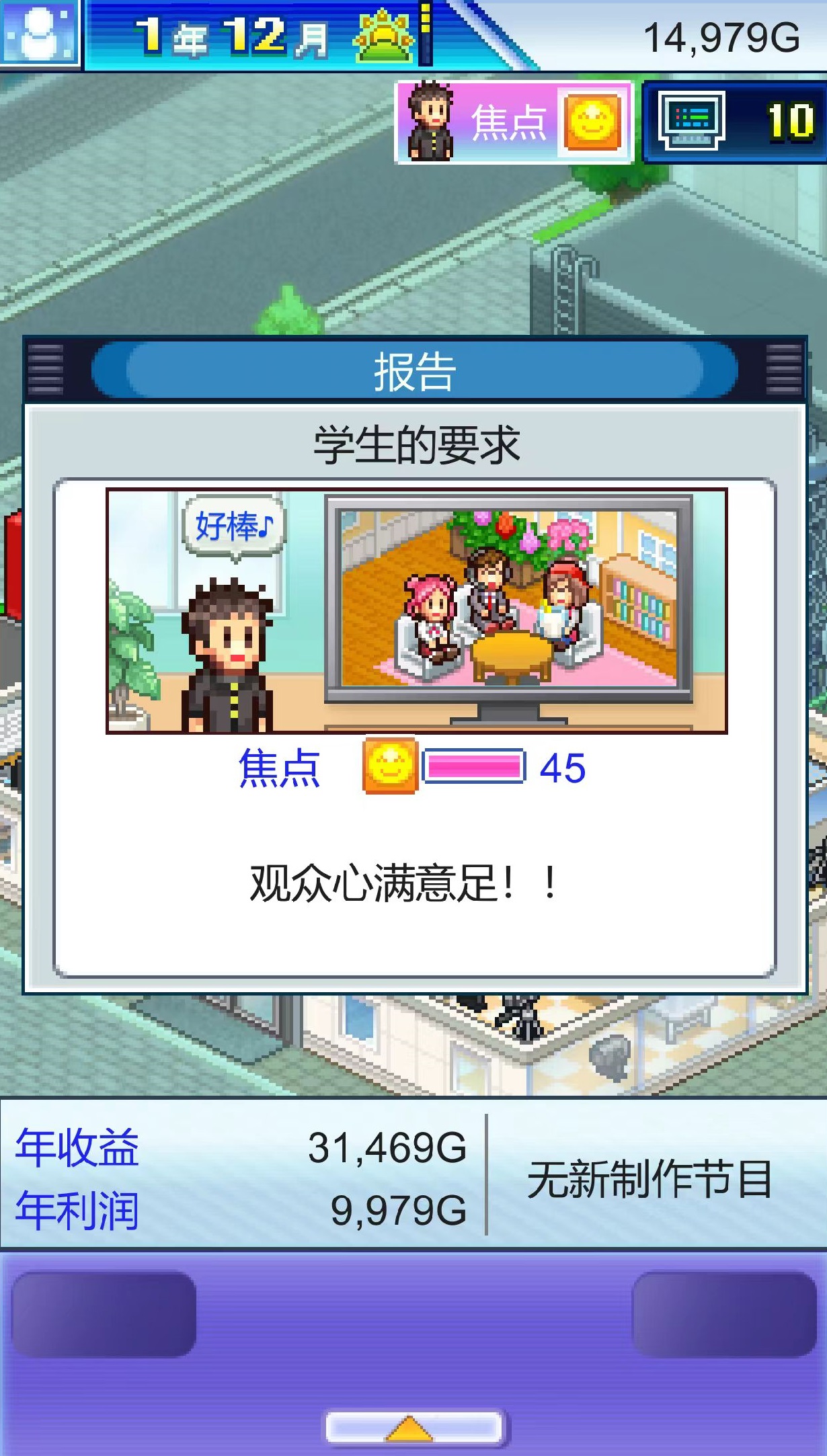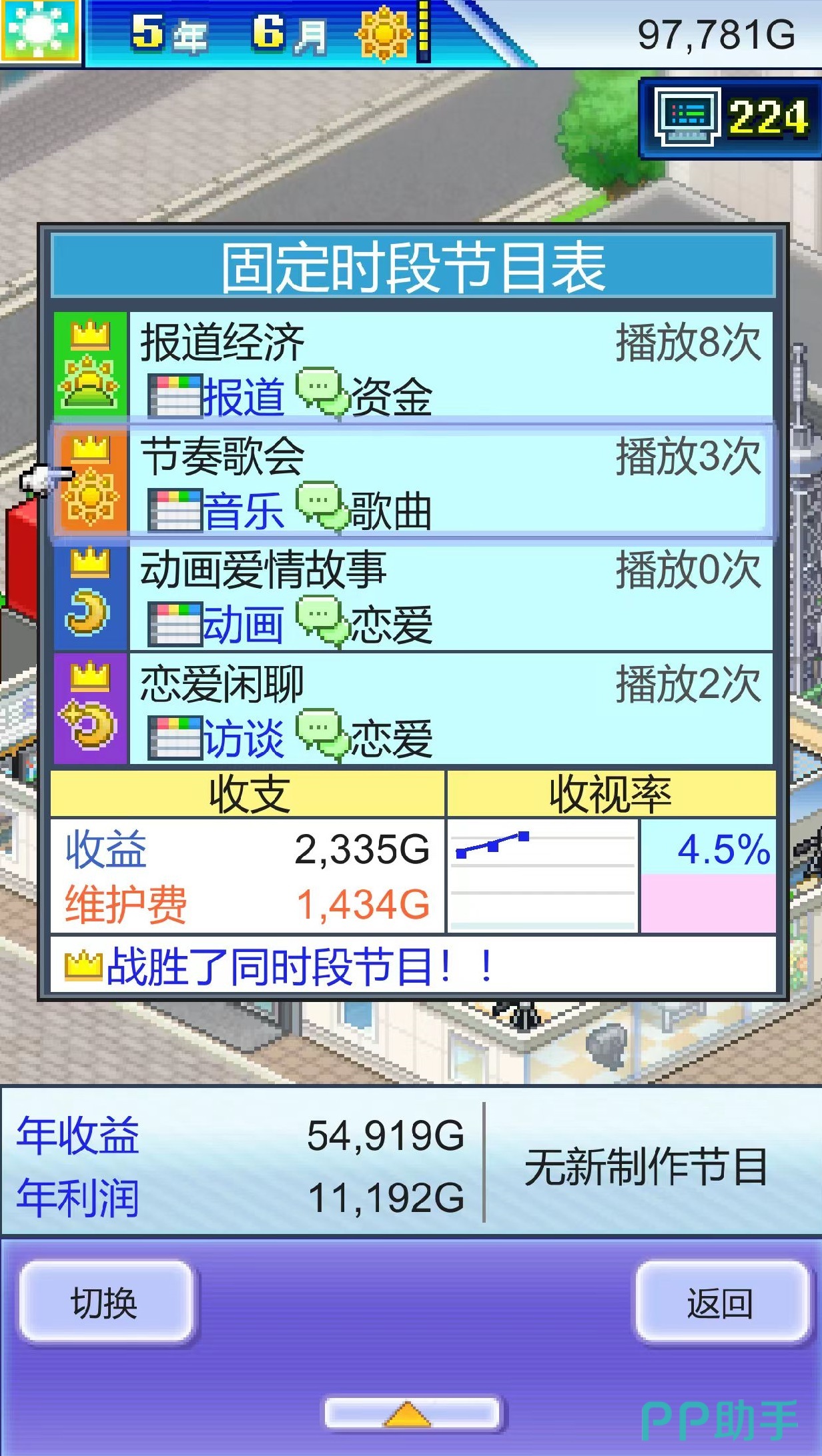 节目内容设计是成败关键。玩家需自主决策类型组合,涵盖综艺、新闻、电视剧、动画四大基础品类,并为每个项目匹配专业团队——主持人把控节奏、编剧构建故事、摄影保障画质、演员传递表现力。题材融合策略同样重要,例如“搞笑+运动”激发年轻群体兴趣,“恋爱+都市”精准触达情感受众。节目播出后,收视率成为核心KPI:数值越高,广告报价越优,资金回笼越快,品牌声量同步攀升。游戏赋予玩家极高自由度,既可能打造出现象级爆款,也可能因搭配失当产出低口碑作品。为降低失败风险,需系统开展员工成长建设,包括人才招募、岗前培训、能力升级等多维度培养路径,员工综合素养直接决定成片质量上限。