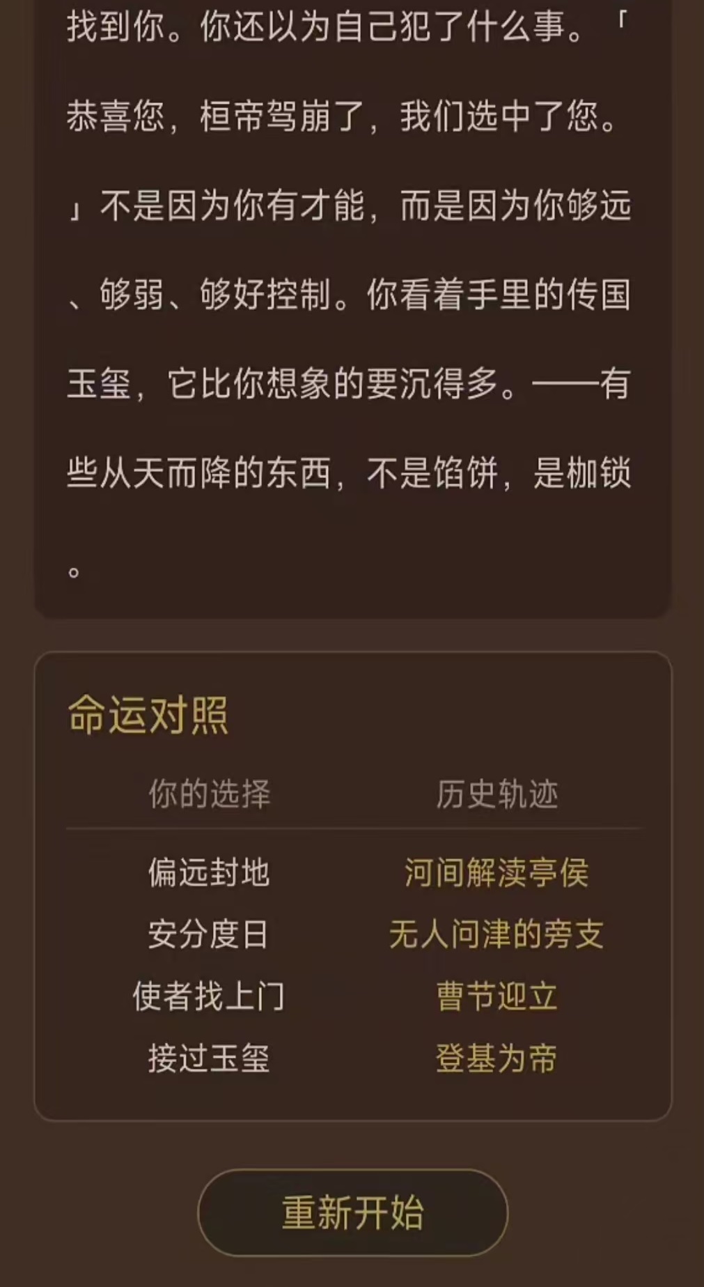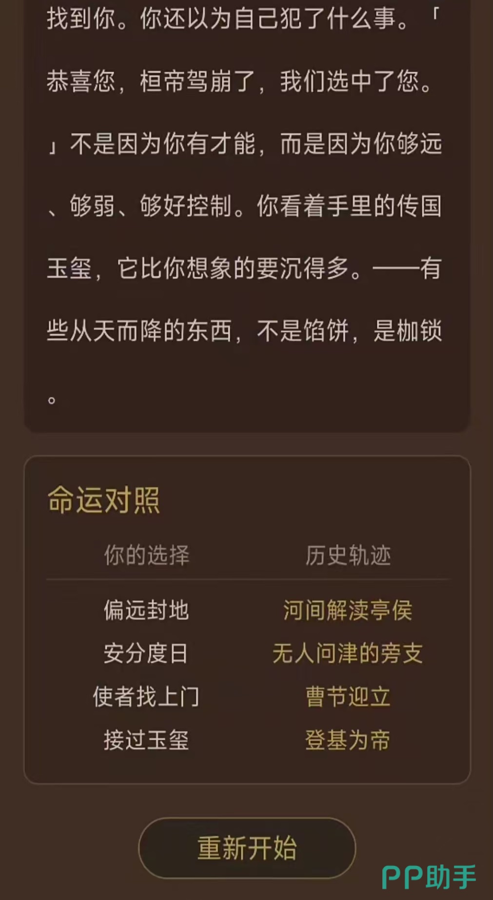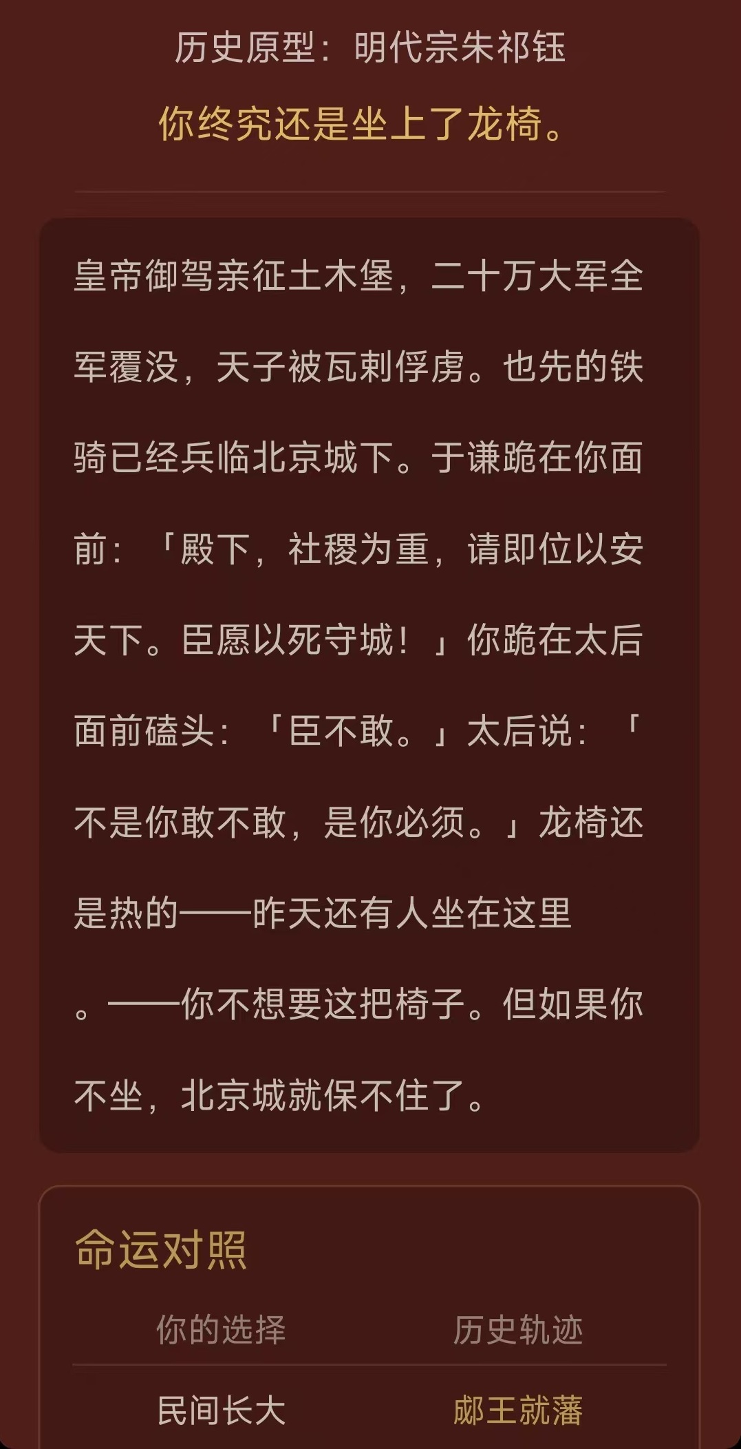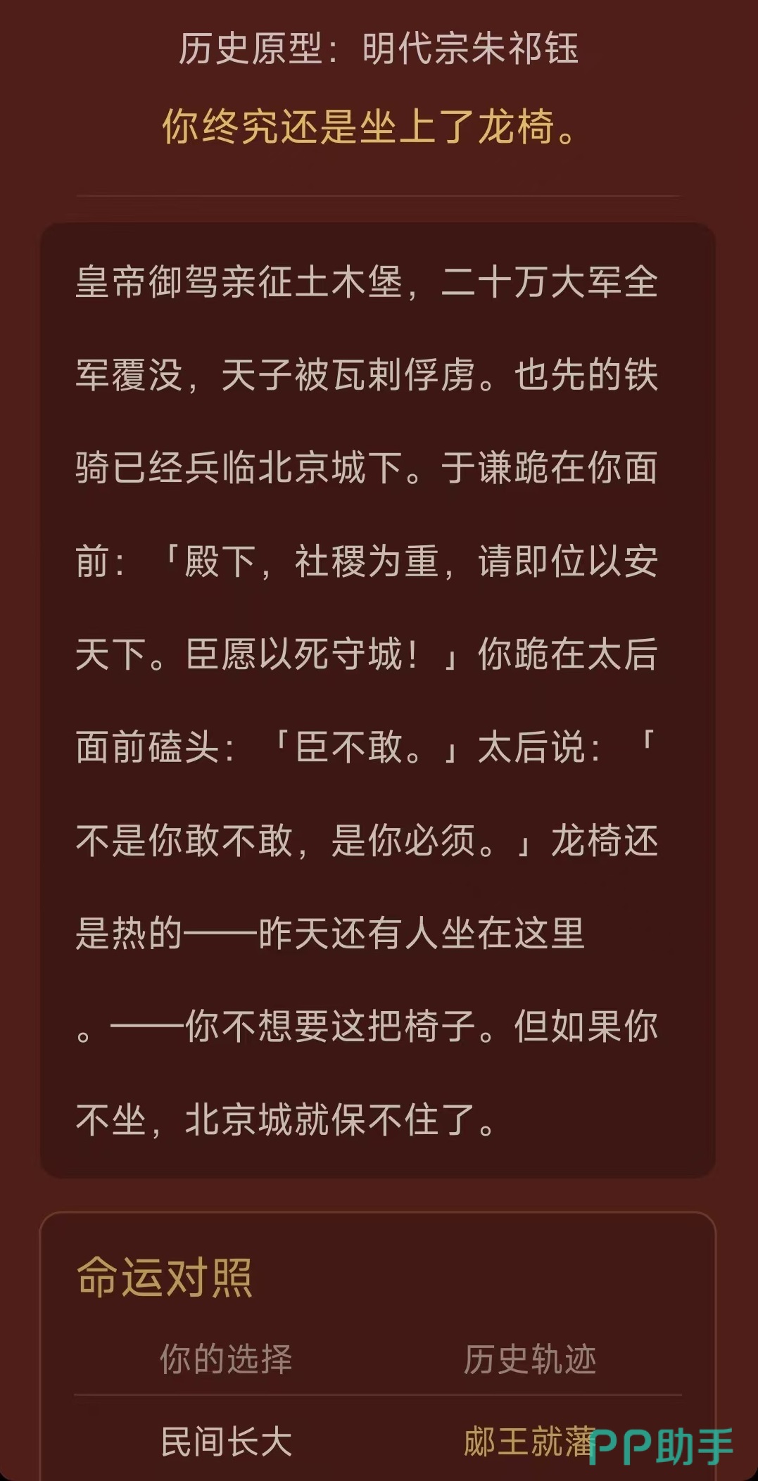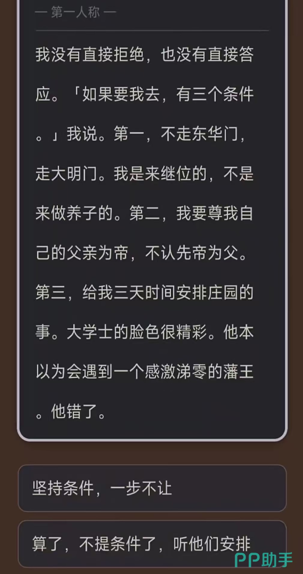 需要特别说明的是,《我不想做皇帝2》本质属于强剧情驱动型文字冒险游戏,而非深度策略模拟或宏观治国类作品。虽然游戏中设有朝堂权谋、派系博弈等元素,但系统设计聚焦于角色个人成长轨迹与命运抉择,核心目标始终围绕“成为皇帝”这一主线展开,而非以登基后治理国家为玩法重心。玩家体验更侧重沉浸式叙事与因果反馈,而非复杂资源调配或长线政体建设。