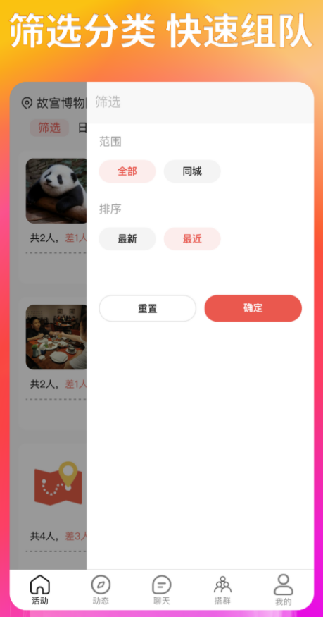 同城找伴寻搭子,正规平台更真实,《搭子社交》需要严格的实名认证机制,发起活动需完成实名以及人脸审核,能最大程度保证用户真实性,杜绝虚假账号,它自带地图模式,活动位置清晰可见,方便用户线下汇合,支持多种费用支付方式,发布活动后自动创建群聊,方便参与者沟通,还可以实现匿名吐槽来抒发自己的烦恼,并缓解社交带来的压力。