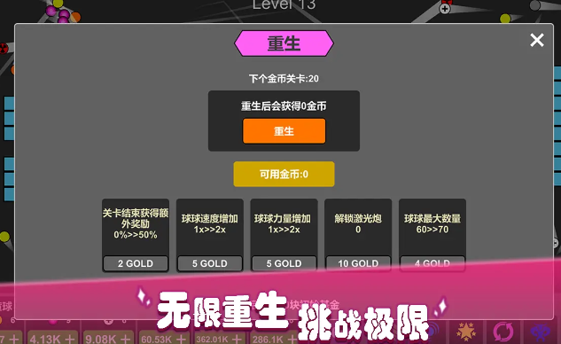 在经典打砖块玩法基础上加入放置机制,关卡无终点限制,砖块与挑战目标持续生成,营造持久流畅的消除节奏。当前版本提供六种特性各异的小球,包括分裂弹、穿透弹、冰冻弹等,玩家需依据砖块排列结构动态切换球种,提升策略维度与操作自由度。