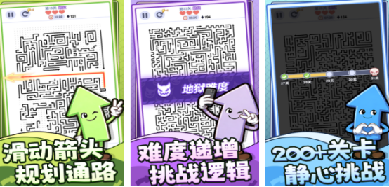 在各类小程序游戏中,消箭头也是人们非常感兴趣的游戏模式,以箭头主题为主要代表作,通过匹配箭头指向,轻松完成消除,融入完整的动作元素,如屏幕控制箭头,改变方向及障碍,超过上百个关卡,每个关卡都有相应的时间或者步数限制,后期加入冰块等障碍物,复杂的箭头联动机制,按照具体的顺序来消除,避免有路径堵塞的情况。