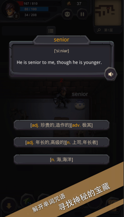 一个融合了英语学习与地牢冒险的RPG手游,玩家需要探索随机生成的城堡地牢,探索时遭遇怪物要通过拼写单词发起攻击,单词的长度和难度会影响攻击的伤害。城堡有多个楼层,包含宝箱、单词解谜等各类随机事件。角色也可以进行升级强化,解锁技能。游戏中的单词拼写错误时会给出音标、释义与正确答案,同时配有标准发音带读。