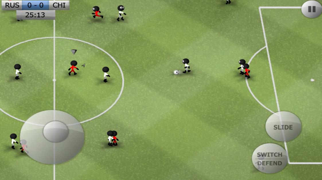 以极简火柴人形象构建赛场角色,人物造型统一,仅通过球衣配色区分阵营。玩家选定队伍后即可进入实时对战模式。界面底部左右分区设计清晰:左侧虚拟摇杆控制球员跑位,右侧按键集成传球与射门功能,响应迅速,操作反馈直观。