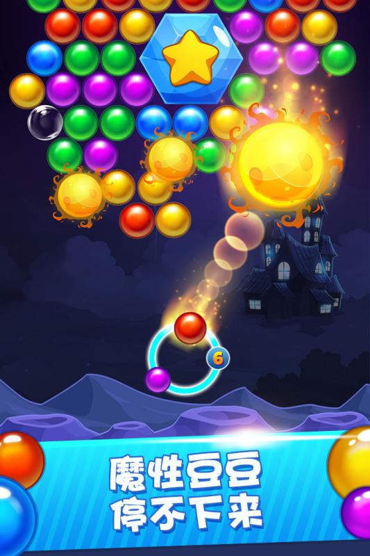 融合祖玛式弹射瞄准与泡泡龙消除逻辑的益智射击游戏。玩家控制发射台角度与力度,将豆豆精准射向同色集群,达成三连及以上即可清除。关卡内置炸弹、冰冻、彩虹弹等辅助道具,有效缓解高难度局面压力;全局排行榜实时更新通关用时与得分排名,全游戏共设数百关卡,难度梯度平滑递进。