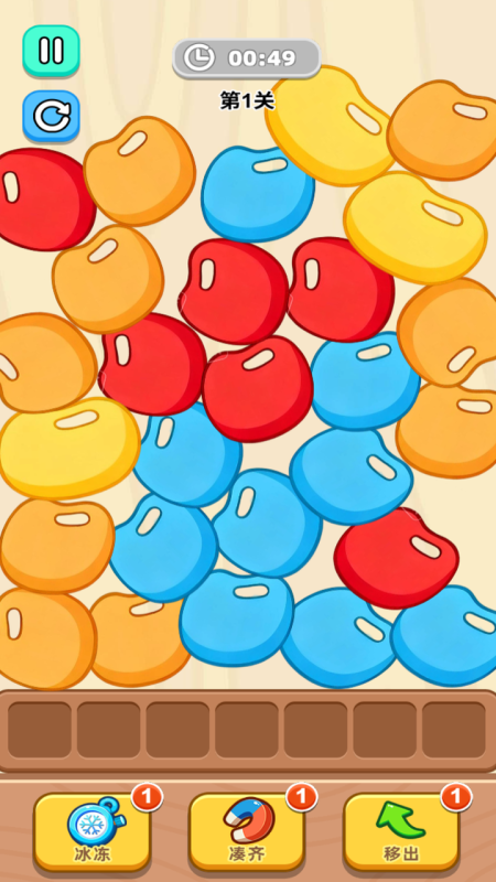 采用经典三消逻辑,支持触屏拖拽连线操作——当三个或以上同色豆豆被直线连接时即触发消除。消除过程伴有粒子爆破、光效涟漪及节奏音效反馈,配合随机掉落的彩虹特效豆,大幅提升视觉爽感与操作正反馈。关卡目标多样化,涵盖步数限制、指定颜色收集及区域封锁解除等类型。