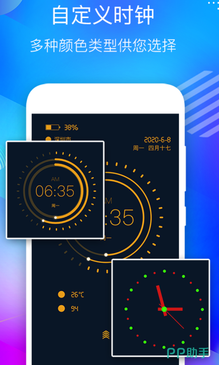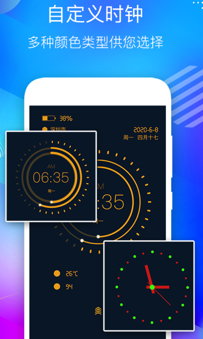 做事情的时候老是要切出去看时间,思路很容易就断了,悬浮窗的方式,解决了这个问题,时间一直挂在屏幕上,随时瞄一眼就行。悬浮窗大小用双指缩放调整,日期和毫秒都能开,抢票卡点这类需要精确到秒的场景也够用。全屏时钟常亮显示,大字体适合答题或背书时,放在旁边参考,不容易分心去刷手机。皮肤风格覆盖多个方向,颜色也可以在缩略图上直接改。