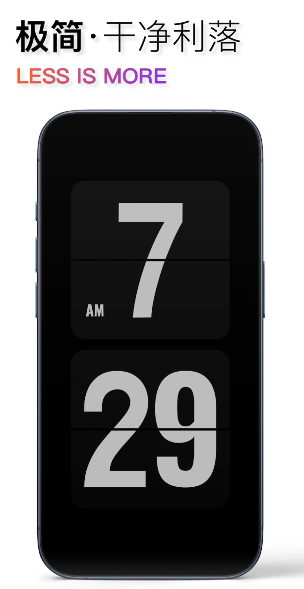 翻页的动作本身就带着一种仪式感,时间就这样一格一格地过去,看着反而比数字跳动更有感觉。3D翻页动画用了专利技术,帧率能跑到120FPS,翻页的物理感做得细腻。界面走极简路线,三米外也能看清楚时间,不抢眼但信息传达干净利落。字体有12种,调色支持256色阶,背景图可以自己导入,桌面风格可以自定义。闹钟最多存20组,工作日和节假日,分开设置。