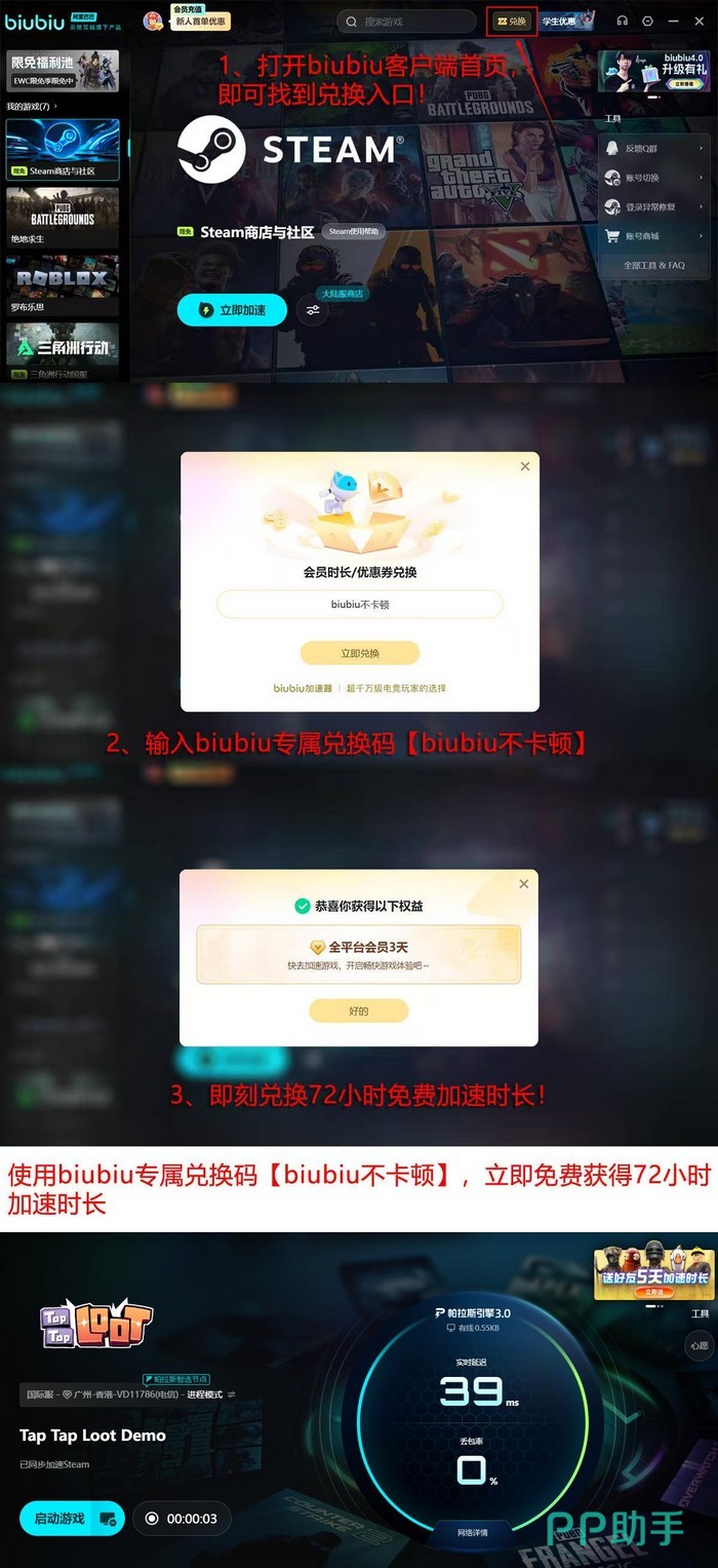 biubiu加速器由阿里巴巴灵犀互娱研发,与九游、交易猫同属该技术体系下的核心产品。近期上线的帕拉斯引擎3.0大幅优化数据传输效率,实测延迟抑制能力显著增强,已通过职业电竞场景验证。PUBG职业选手左梓轩作为体验官深度参与调优,并将biubiu列为pero战队日常训练指定加速方案。新用户可享最长4天免费试用;另提供“biubiu不卡顿”专属口令,新用户激活后获24小时加速权益,新老用户均可额外兑换3天服务,两项时长支持叠加使用。